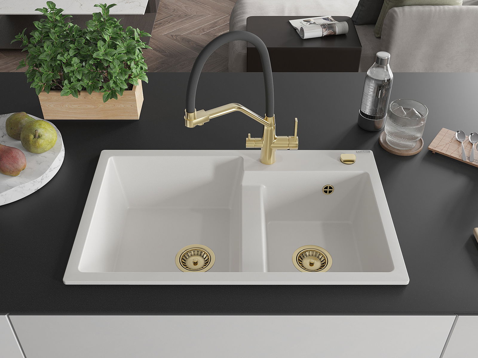 The surface of the sink is resistant to stains and discolouration, making it easy to maintain cleanliness and retain its colour for a long time of use. An aesthetic and practical addition to any kitchen.