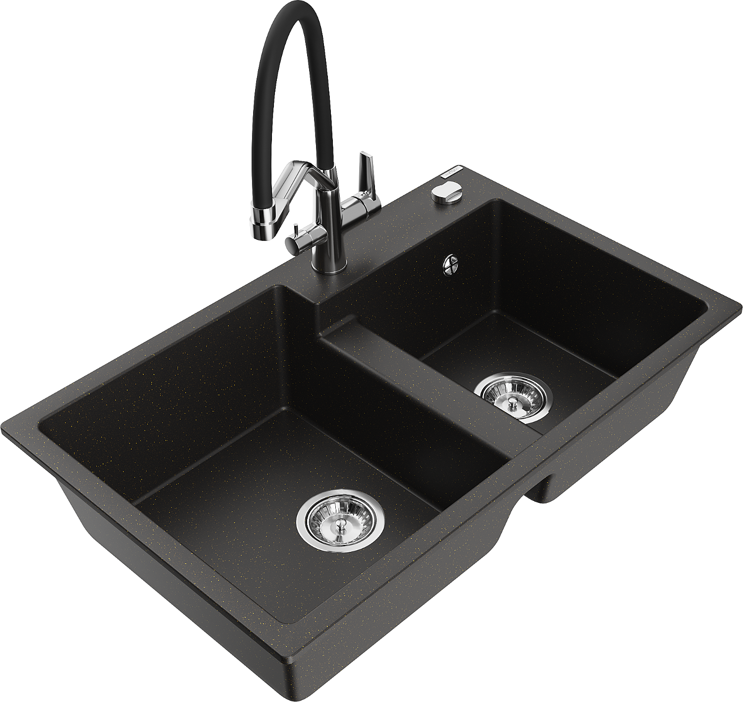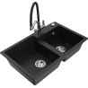 Mexen Tomas granite sink 2-bowl with Duo kitchen tap, black/gold metallic - 6516-75-671701-07