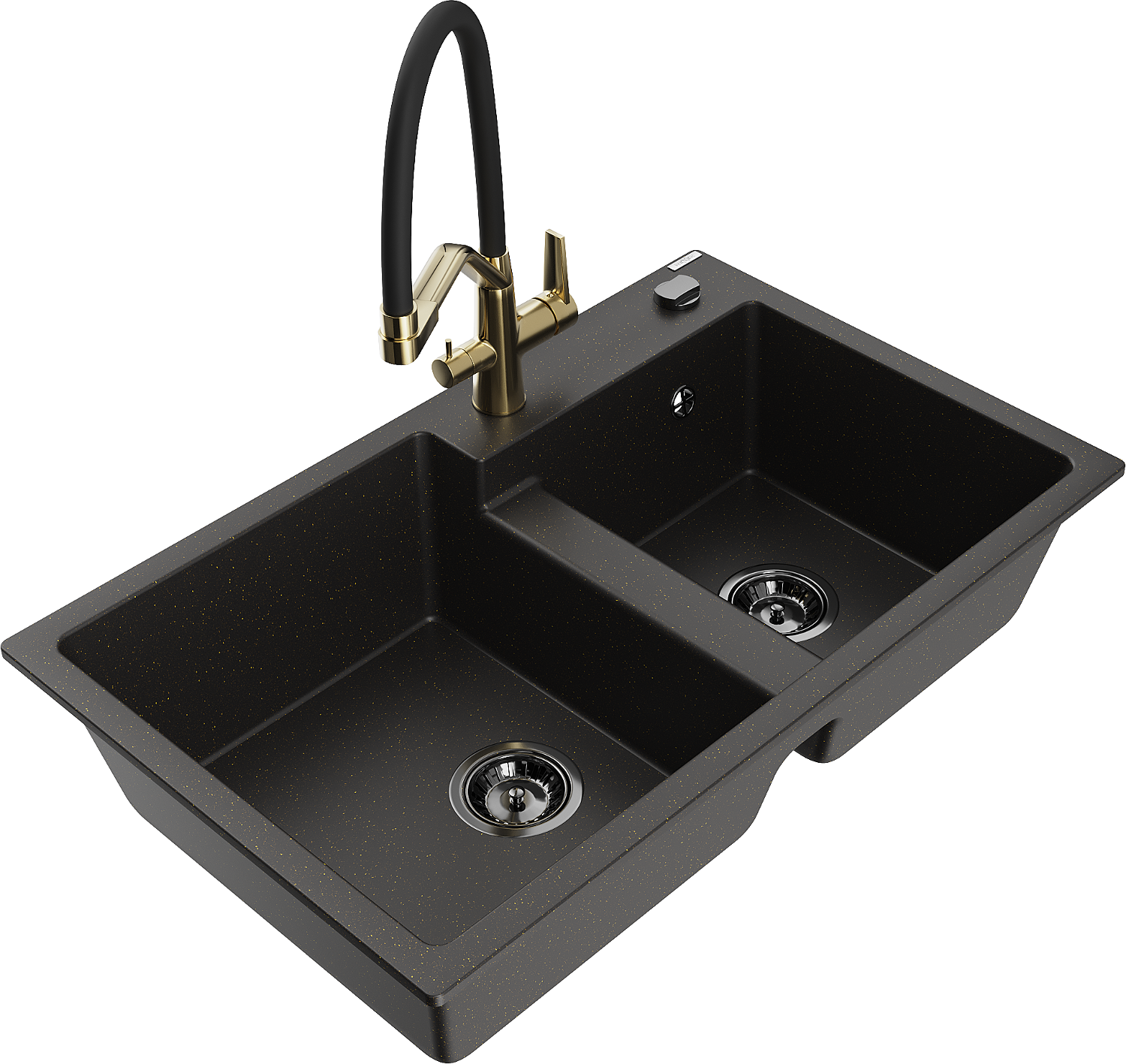 Mexen Tomas 2-bowl granite sink with Duo kitchen faucet, black/gold metallic - 6516-75-671701-57-B