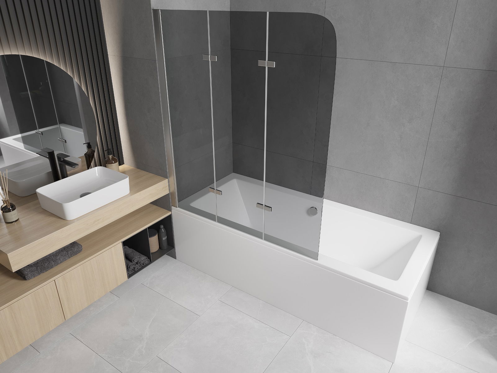 A screen made of three wings with the possibility of folding. This solution saves more space in the bathroom and allows for free use of the remaining space when not using the bathing area.