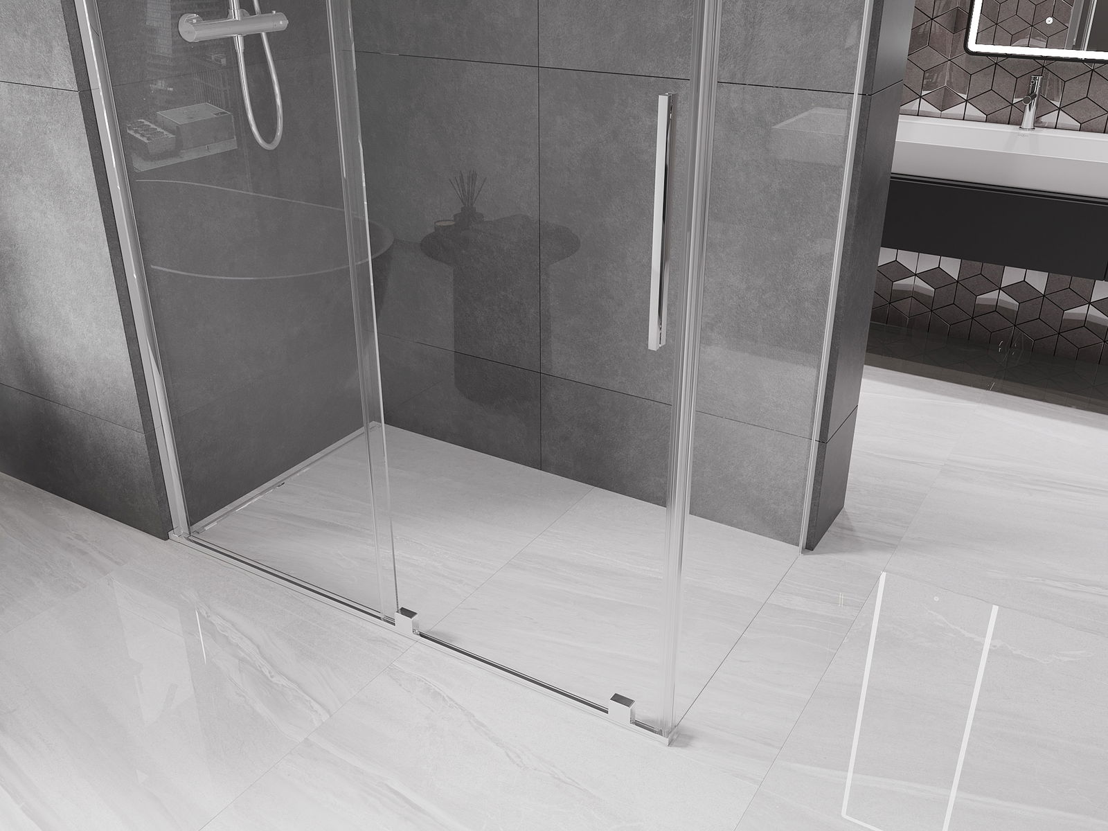 A handy and convenient handle made of stainless steel. The stylish shape combined with a finish that matches the color of the profiles gives a modern and stylish look, highlighting the aesthetics of any bathroom.