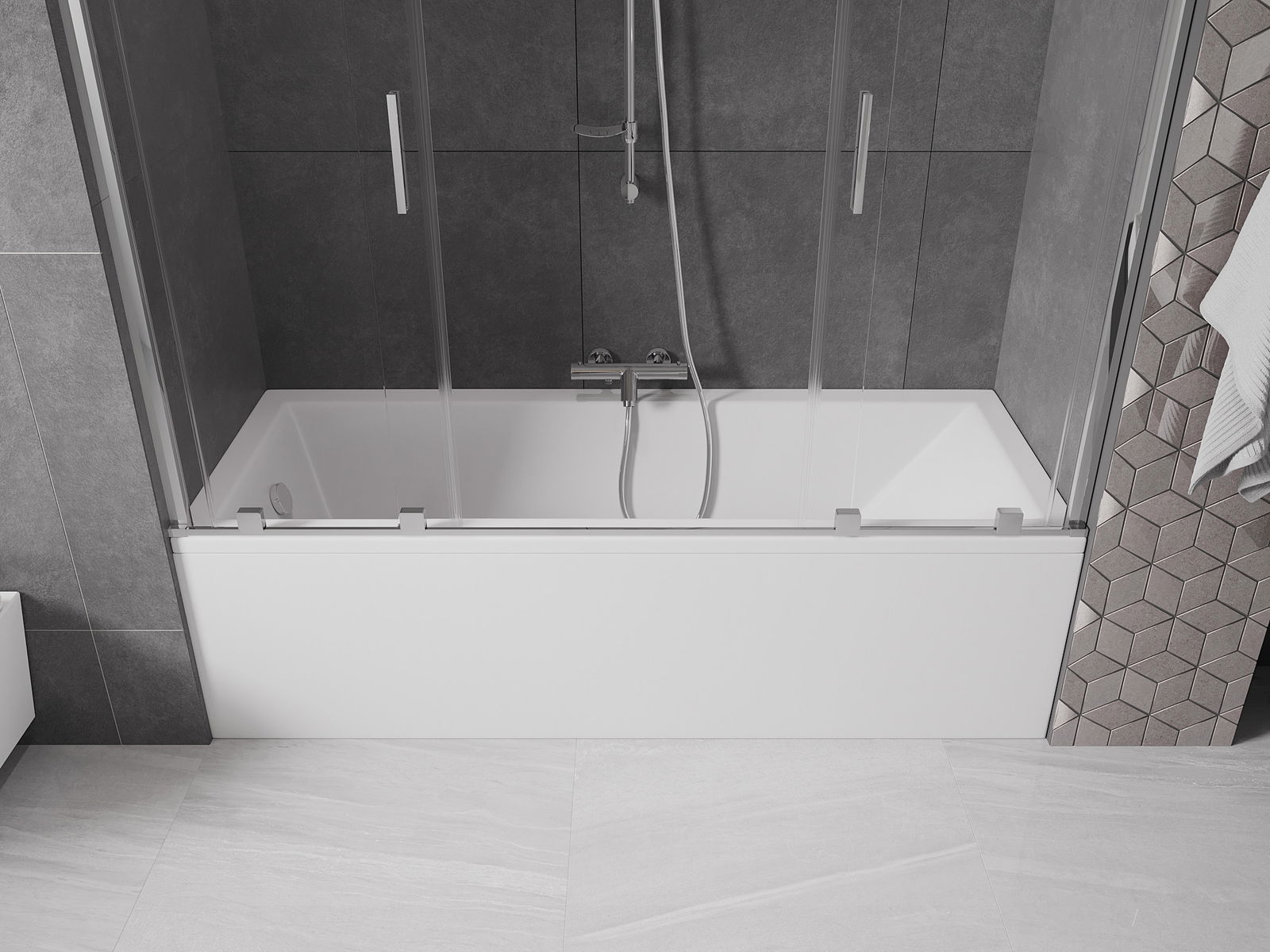 Effective protection against water spilling during bathing. The screen has seals that perfectly fit the glass surface and the edge of the bathtub. A functional solution ensuring safety and easy maintenance of cleanliness.