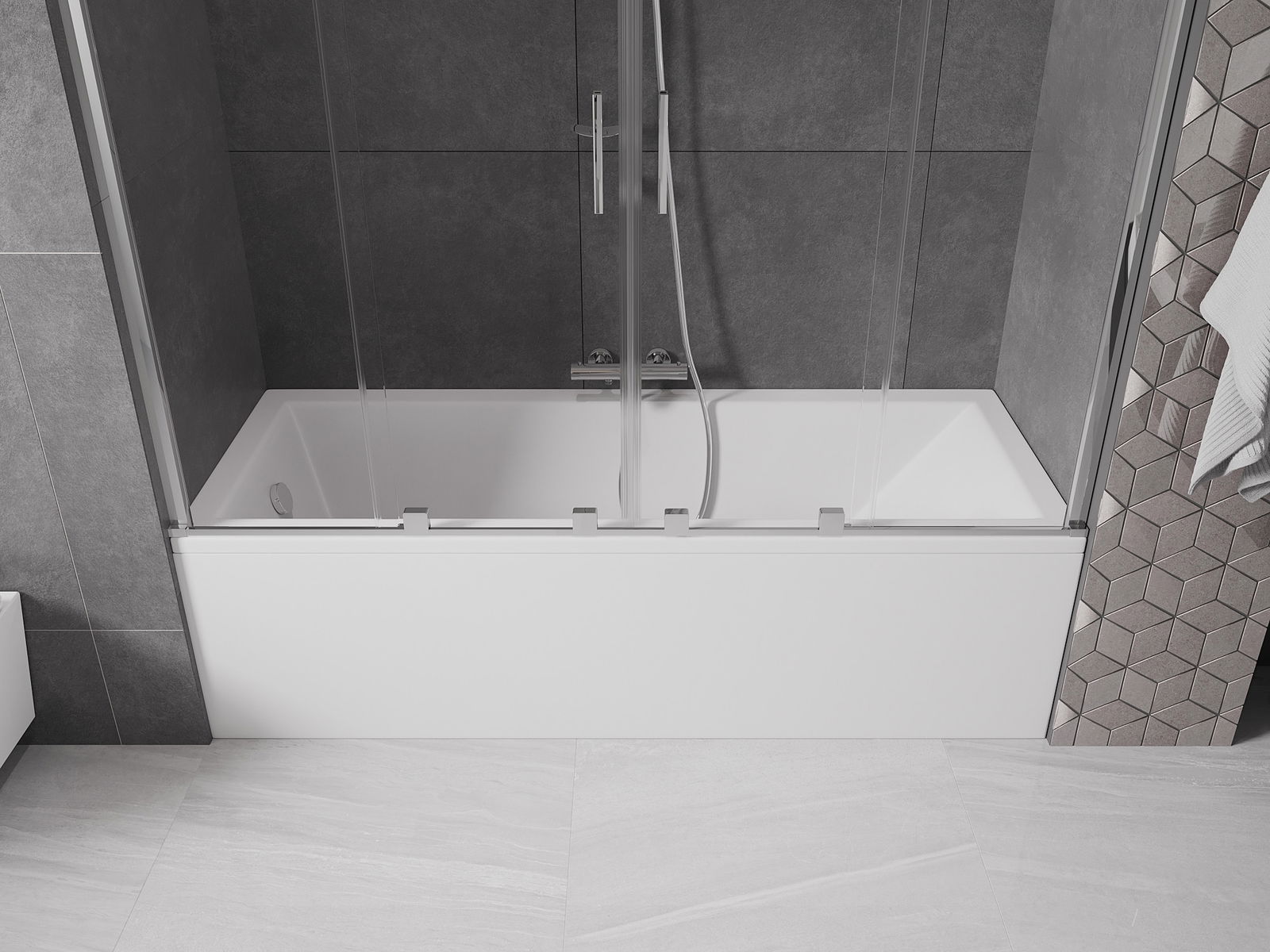 Effective protection against water spilling during bathing. The screen has seals that perfectly fit the glass surface and the edge of the bathtub. A functional solution ensuring safety and easy maintenance of cleanliness.