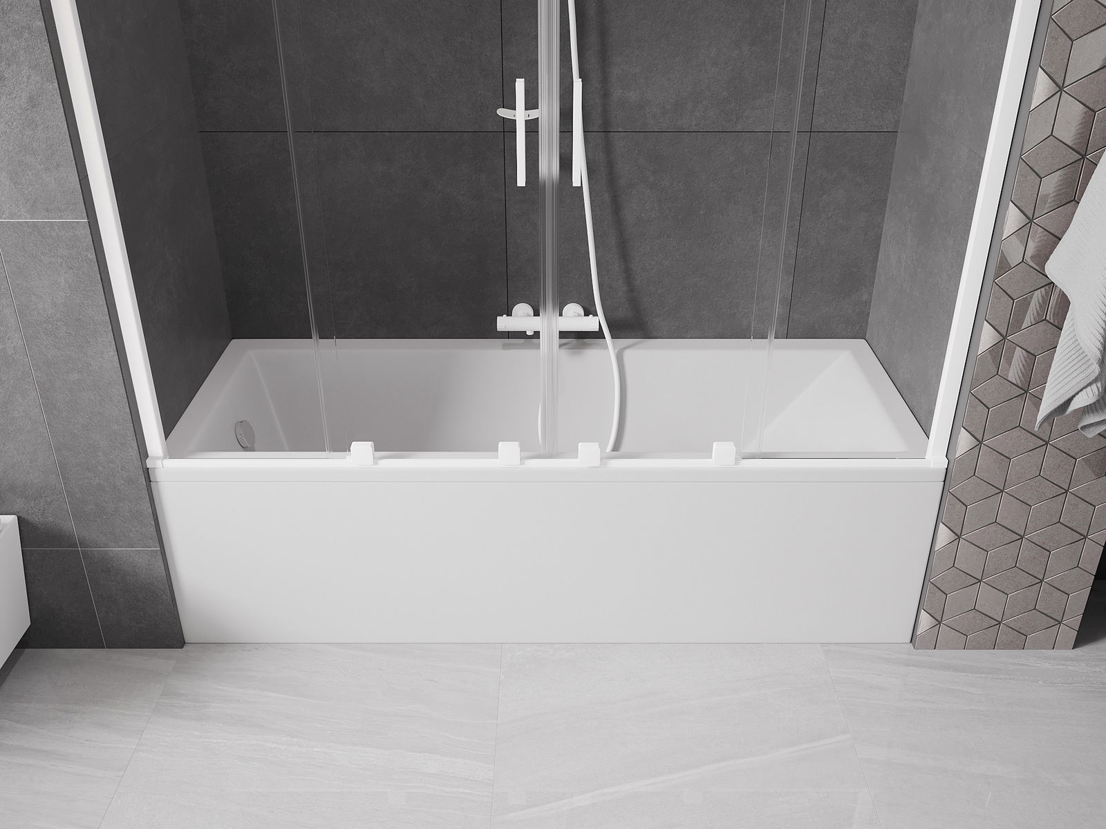 Effective protection against water spilling during bathing. The screen has seals that perfectly fit the glass surface and the edge of the bathtub. A functional solution ensuring safety and easy maintenance of cleanliness.