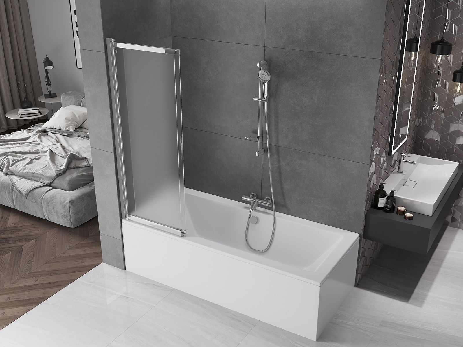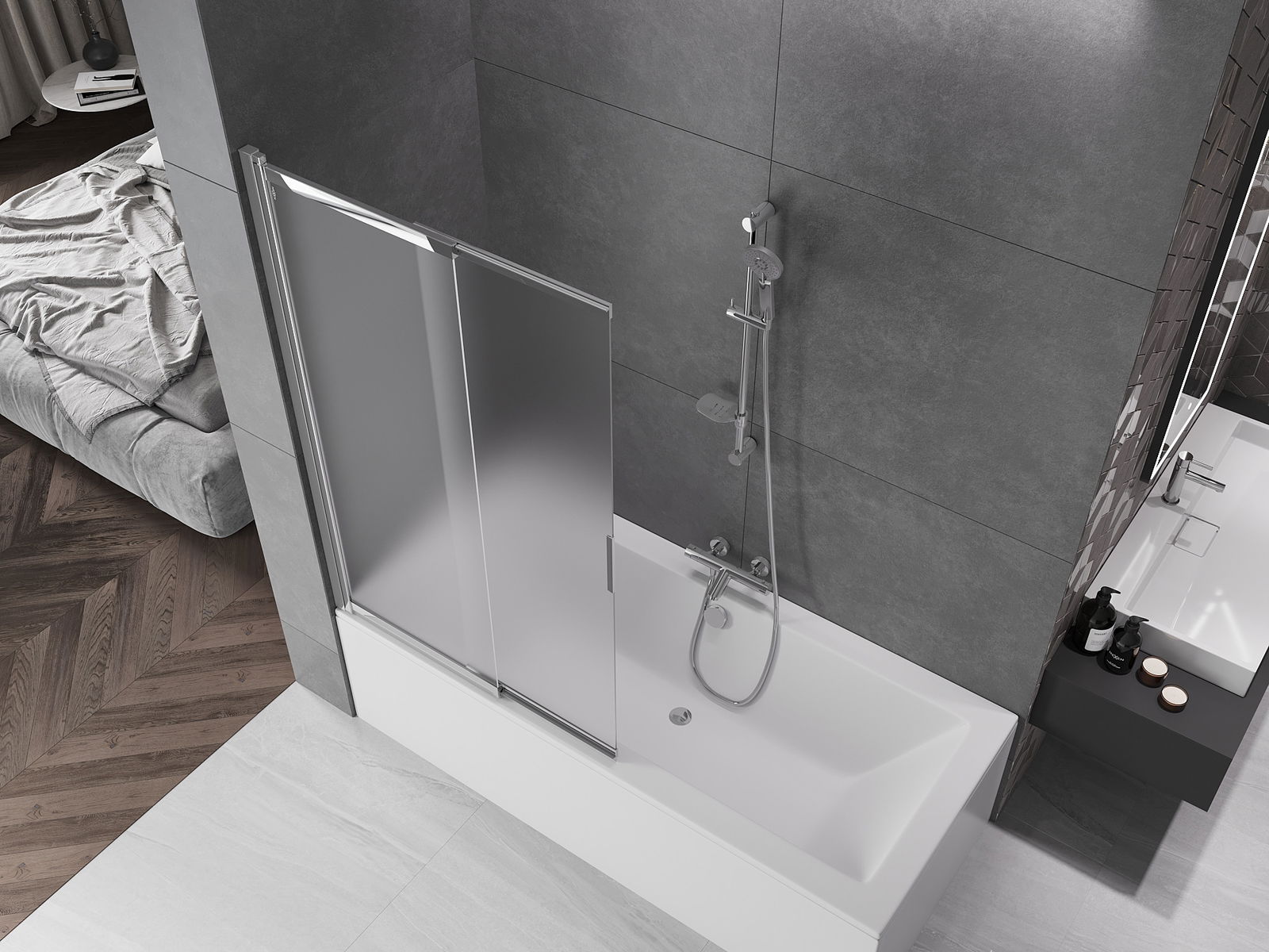 Effective protection against water spilling during bathing. The screen has seals that perfectly fit the glass surface and the edge of the bathtub. A functional solution ensuring safety and easy maintenance of cleanliness.