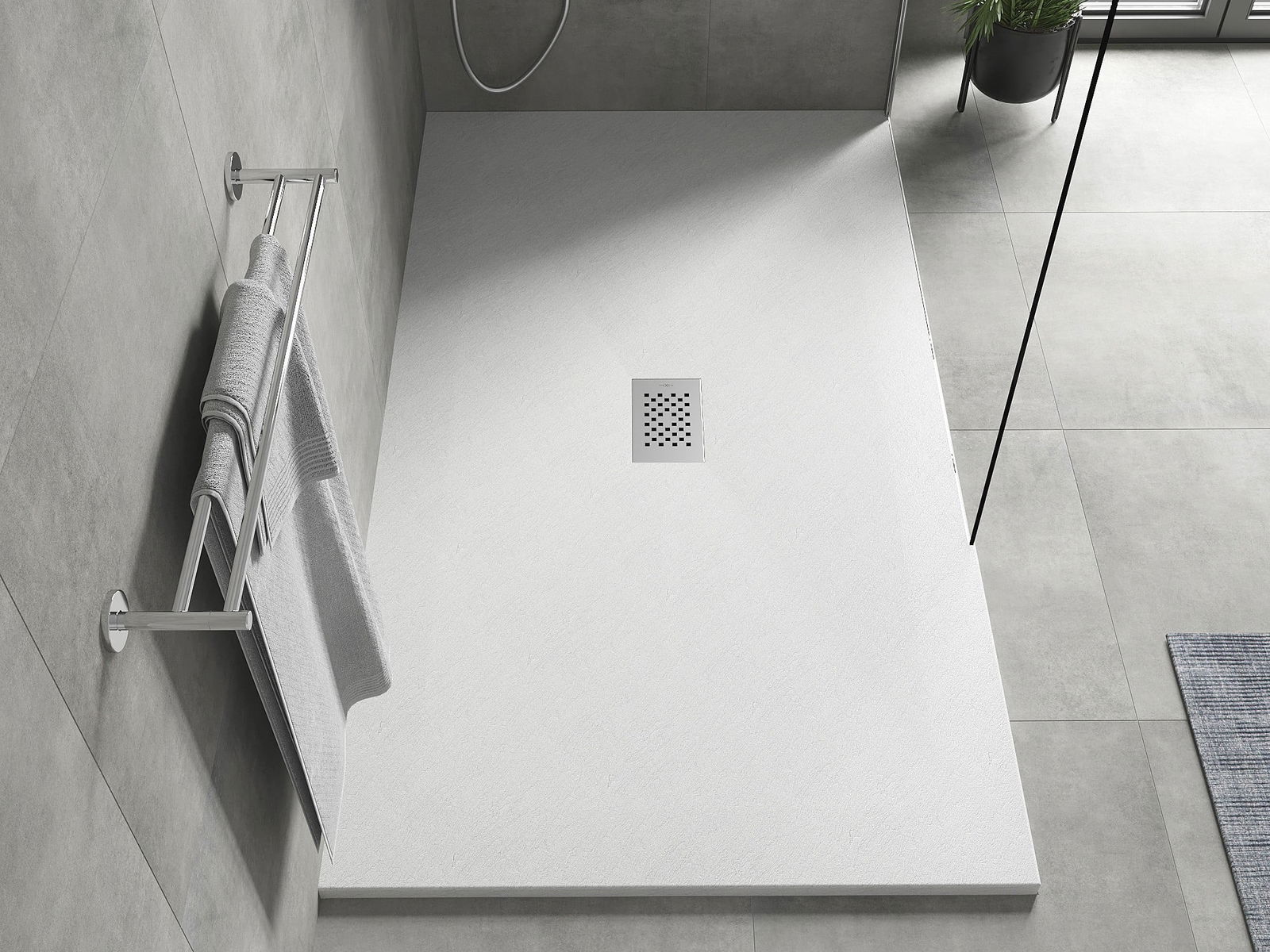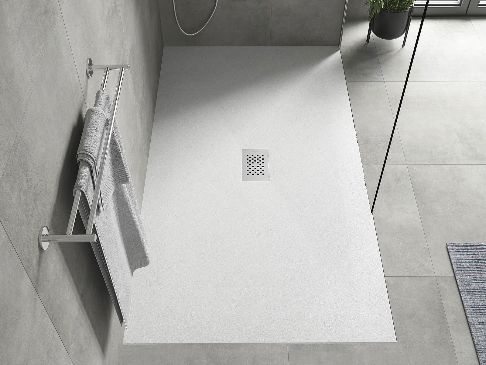 The surface of the shower tray resembles stone in its structure. It is a unique combination of a natural appearance with modern interior design. It adds character, enhances the aesthetics and elegance of the bathroom decor, and delights with its form.