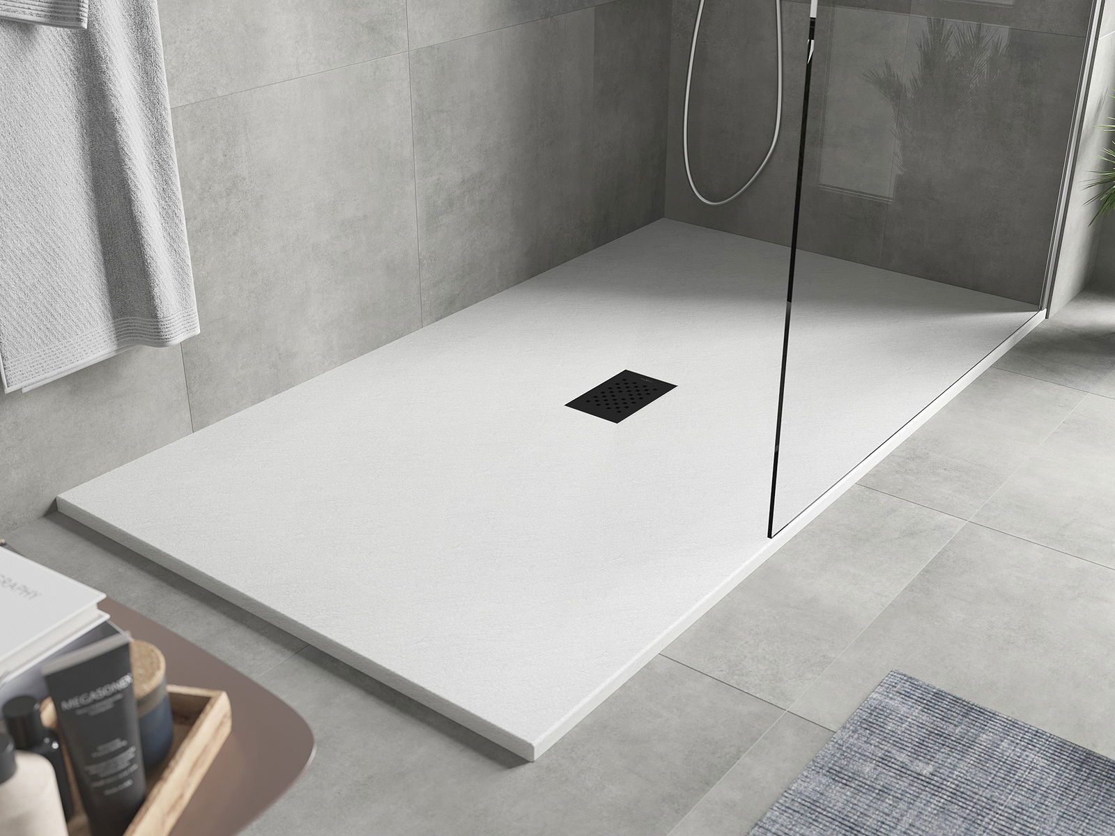 The surface of the shower tray resembles stone in its structure. It is a unique combination of a natural appearance with modern interior design. It adds character, enhances the aesthetics and elegance of the bathroom decor, and delights with its form.