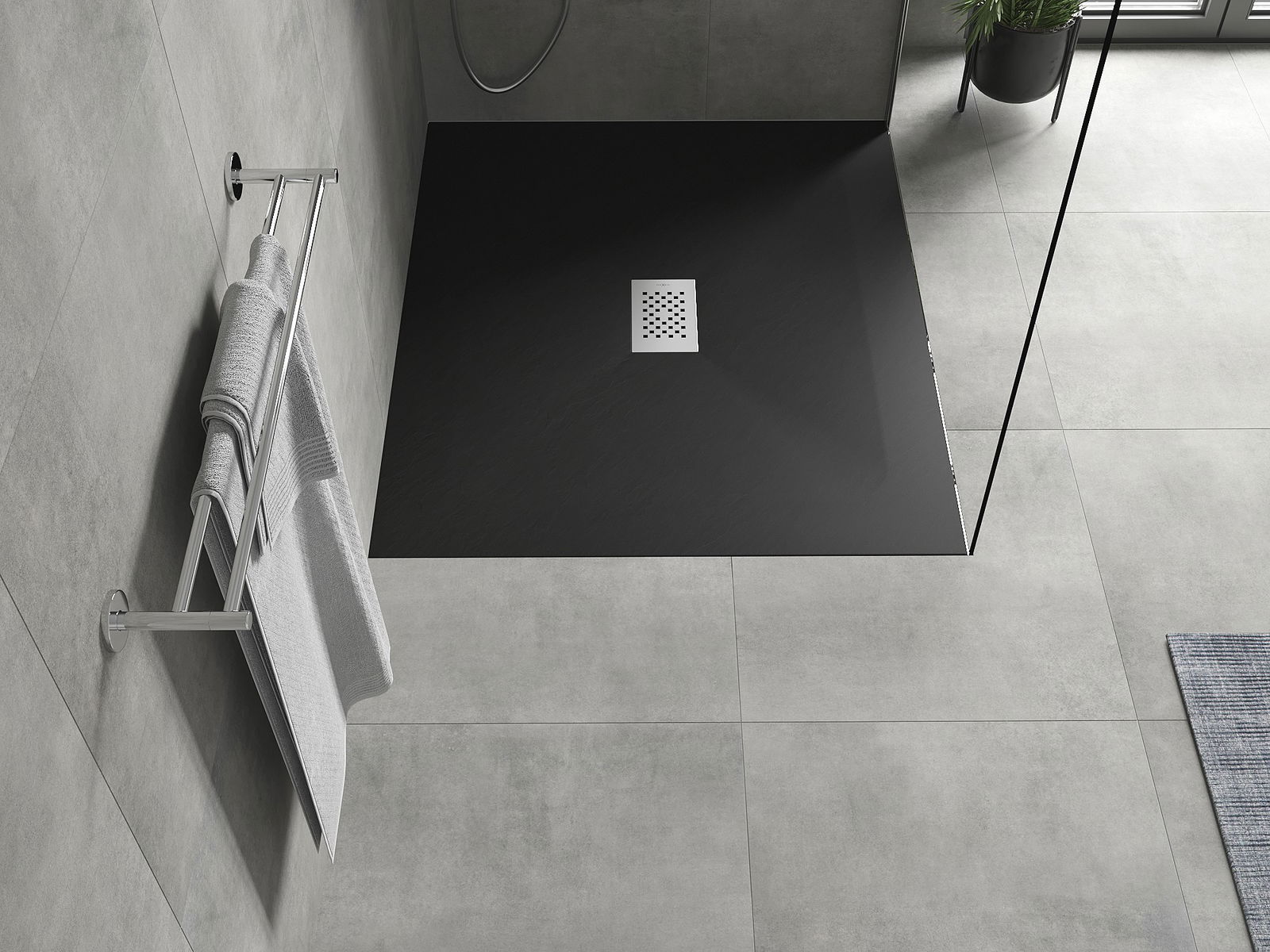 The surface of the shower tray resembles stone in its structure. It is a unique combination of a natural appearance with modern interior design. It adds character, enhances the aesthetics and elegance of the bathroom decor, and delights with its form.
