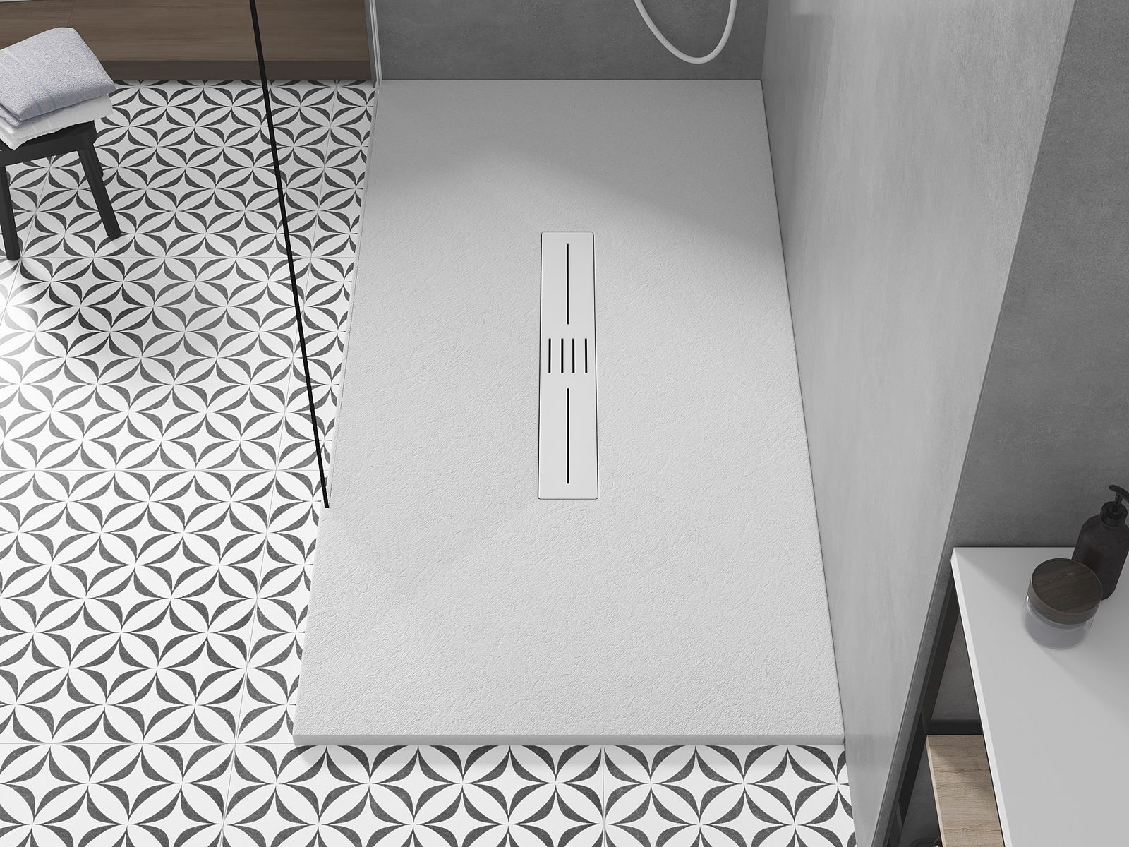The surface of the shower tray resembles stone in its structure. It is a unique combination of a natural appearance with modern interior design. It adds character, enhances the aesthetics and elegance of the bathroom decor, and delights with its form.