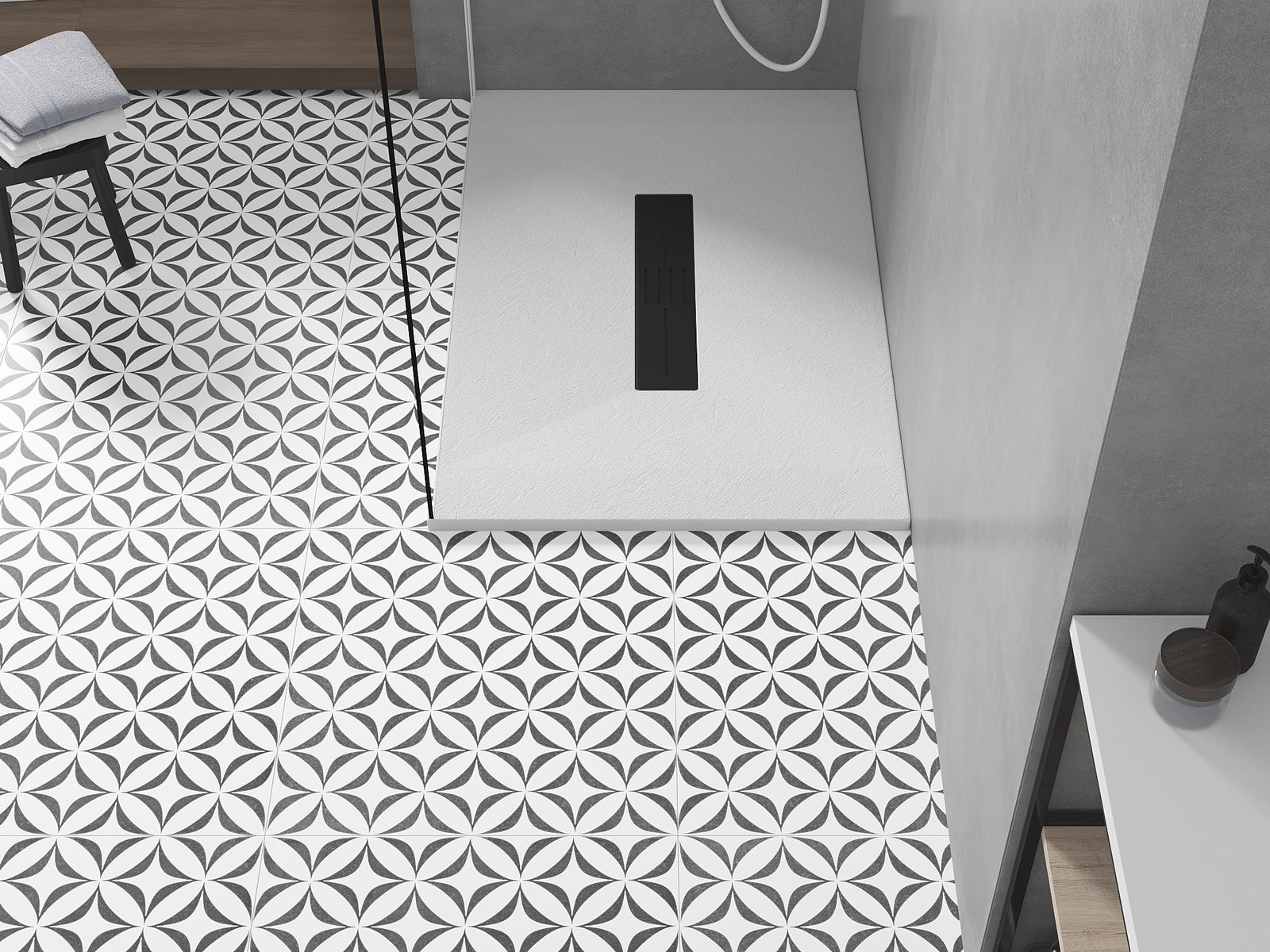 The surface of the shower tray resembles stone in its structure. It is a unique combination of a natural appearance with modern interior design. It adds character, enhances the aesthetics and elegance of the bathroom decor, and delights with its form.