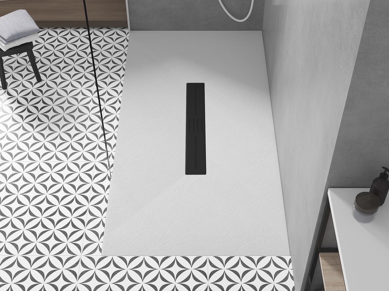 The surface of the shower tray resembles stone in its structure. It is a unique combination of a natural appearance with modern interior design. It adds character, enhances the aesthetics and elegance of the bathroom decor, and delights with its form.