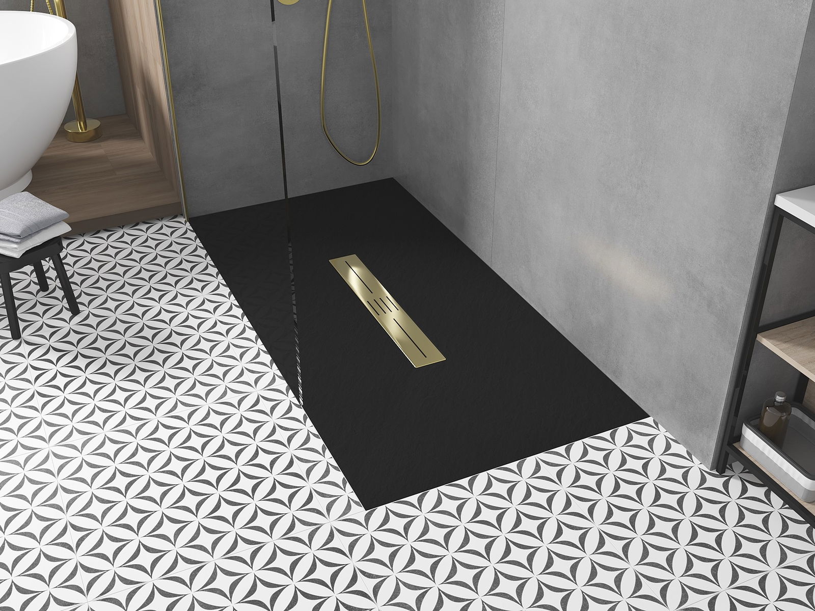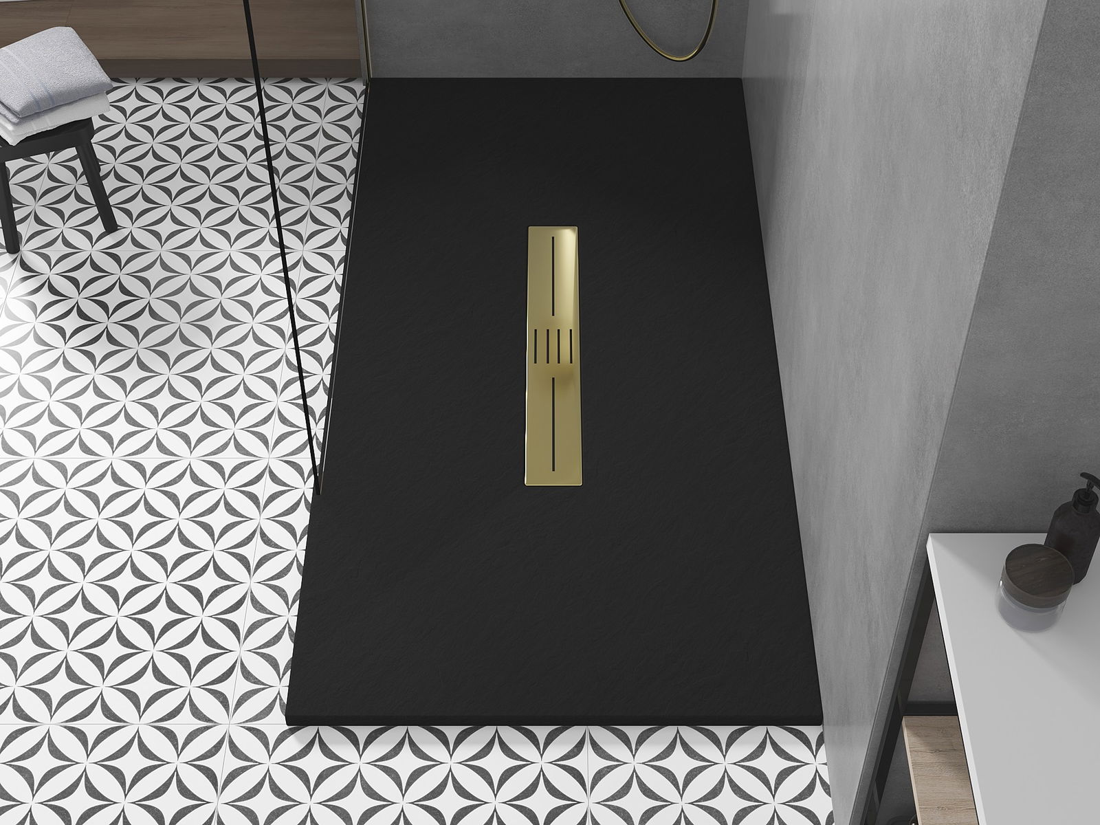 The shower tray is designed in such a way that water can freely flow towards the drain. It ensures quick and effective drainage of water from the surface of the shower tray, preventing the formation of puddles and flooding the bathroom.