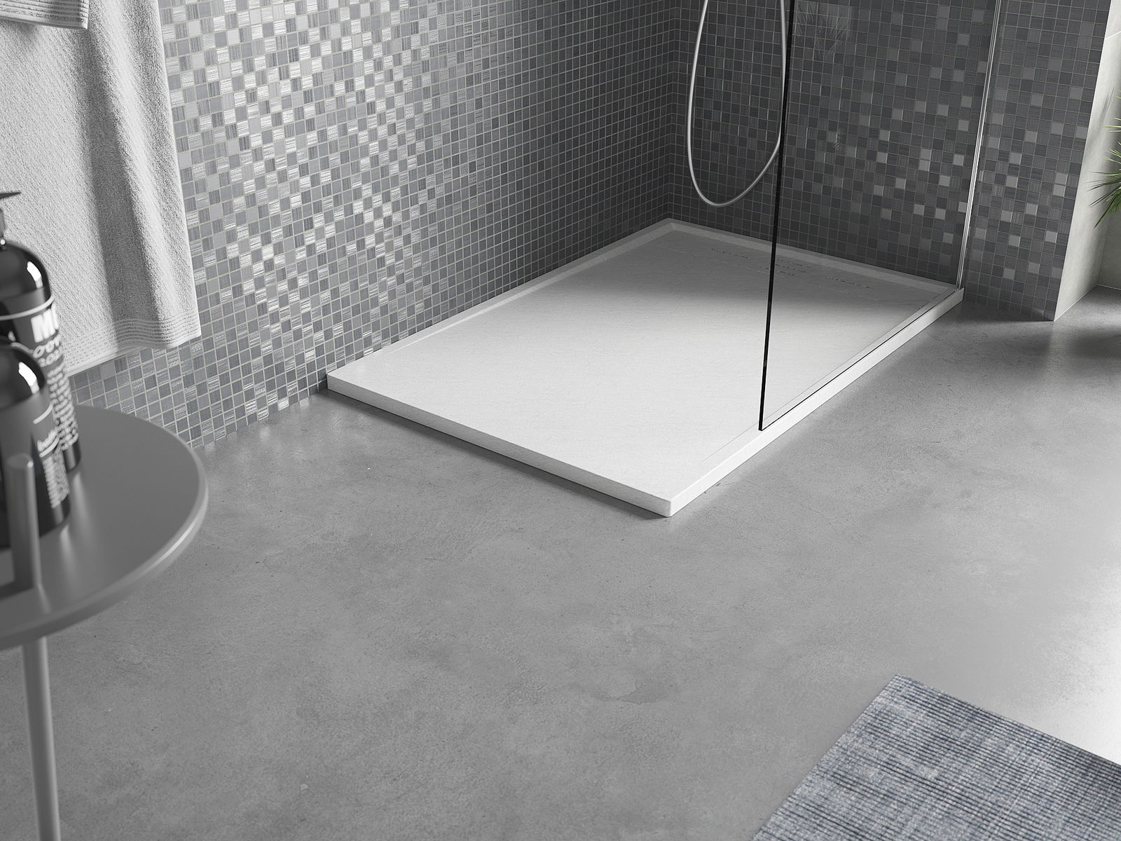 The surface of the shower tray resembles stone in its structure. It is a unique combination of a natural appearance with modern interior design. It adds character, enhances the aesthetics and elegance of the bathroom decor, and delights with its form.
