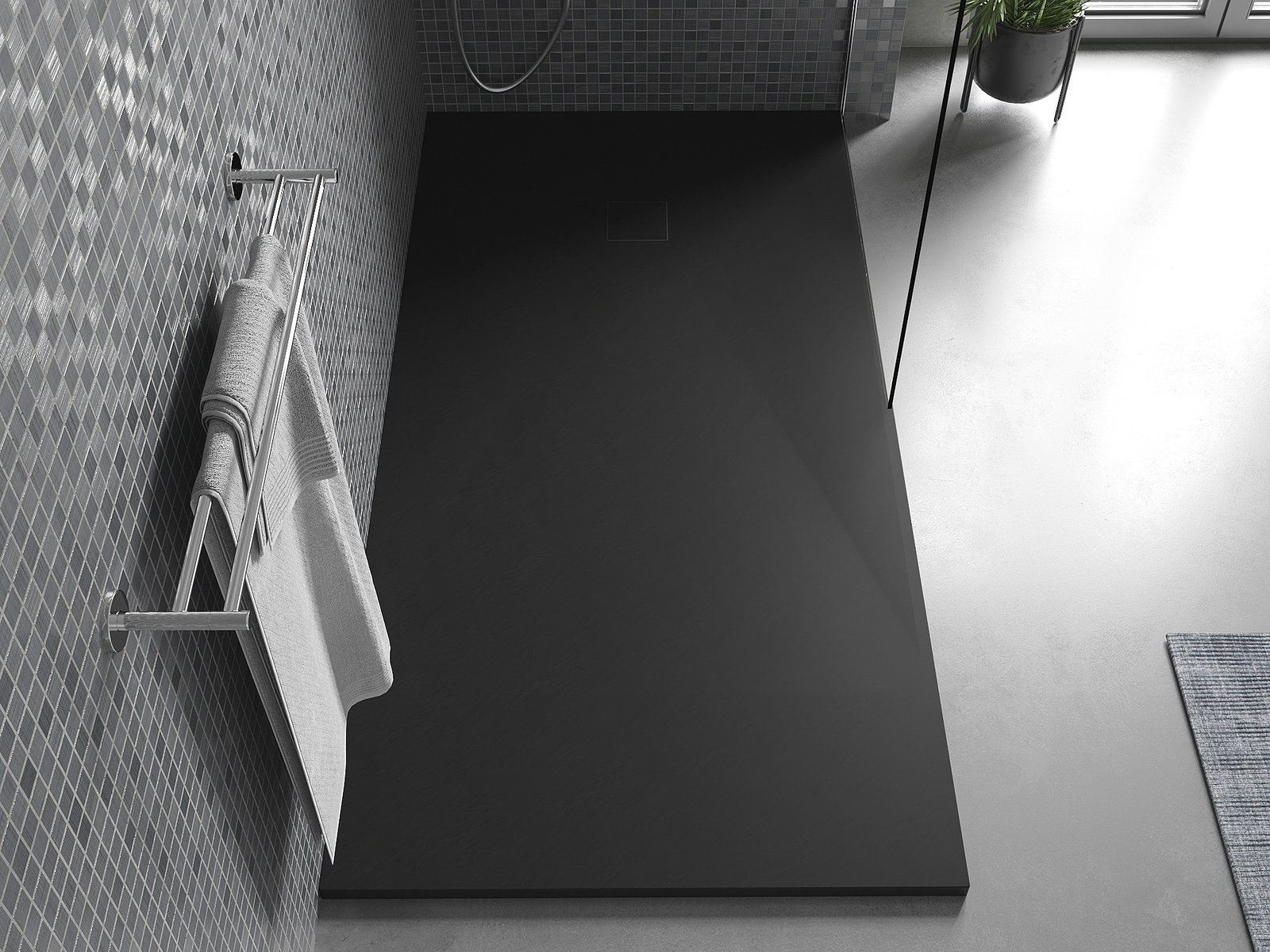 The surface of the shower tray resembles stone in its structure. It is a unique combination of a natural appearance with modern interior design. It adds character, enhances the aesthetics and elegance of the bathroom decor, and delights with its form.