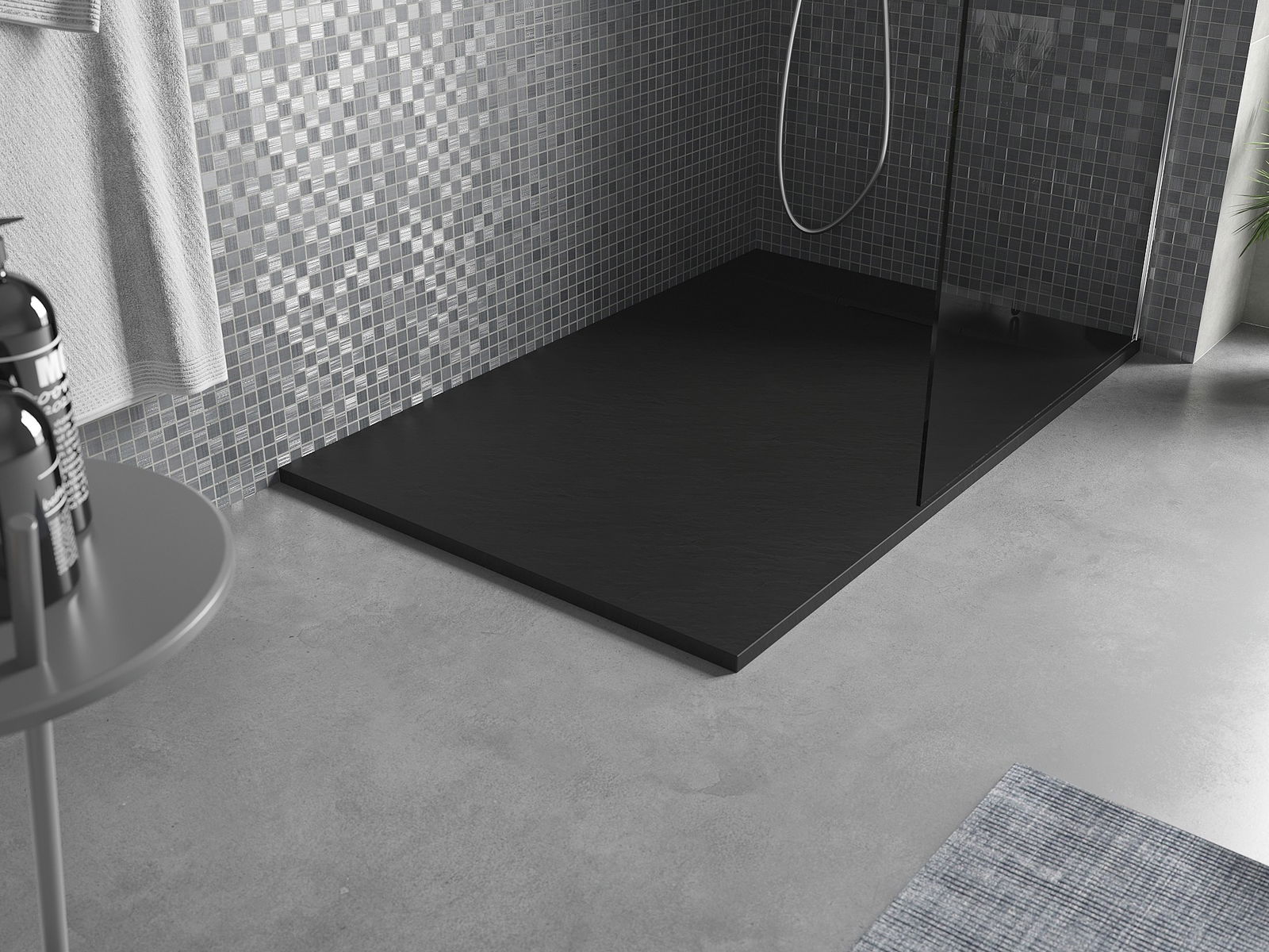 The surface of the shower tray resembles stone in its structure. It is a unique combination of a natural appearance with modern interior design. It adds character, enhances the aesthetics and elegance of the bathroom decor, and delights with its form.