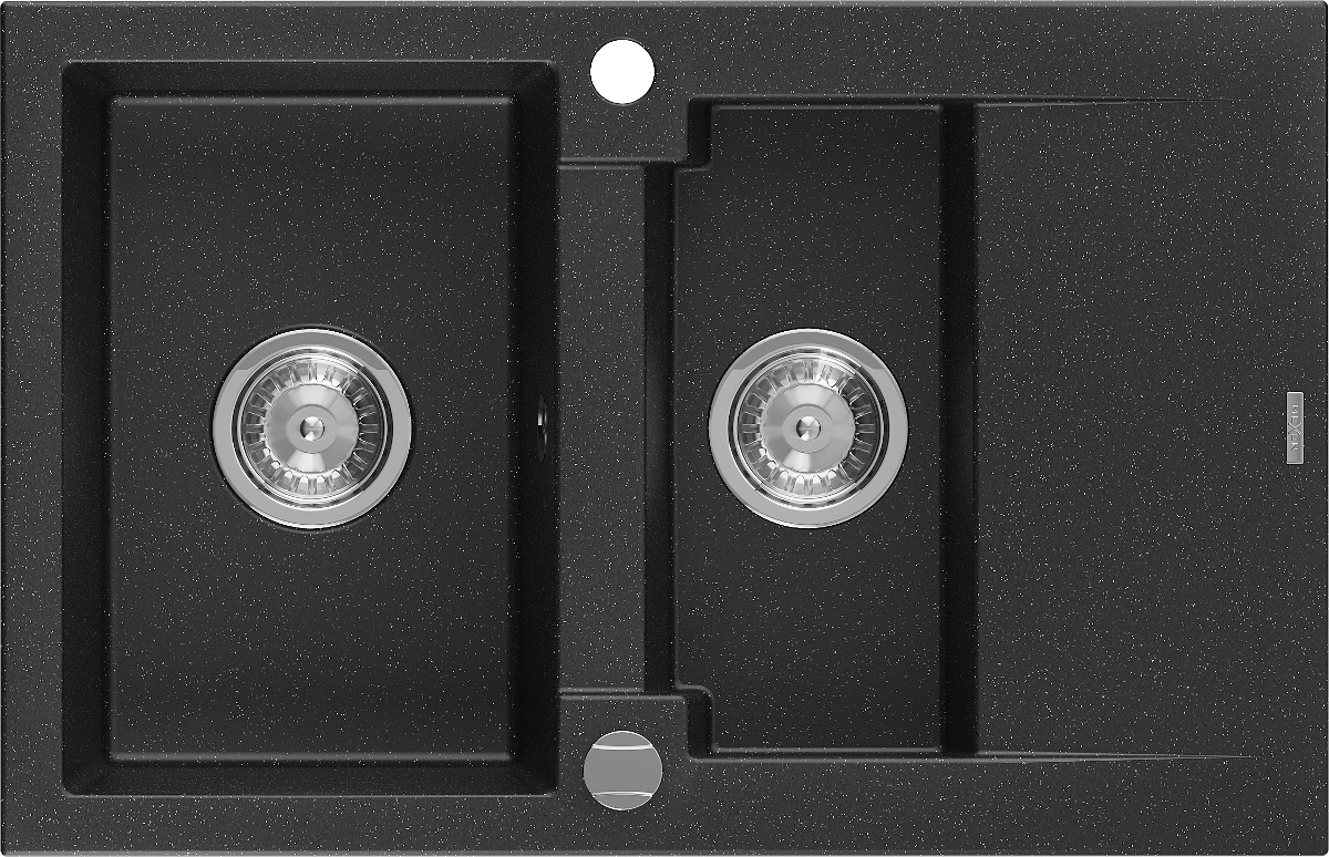 Mexen Gaspar granite sink 1.5-bowl with drainer 737 x 475 mm, black/silver metallic, chrome siphon - 6507731505-73