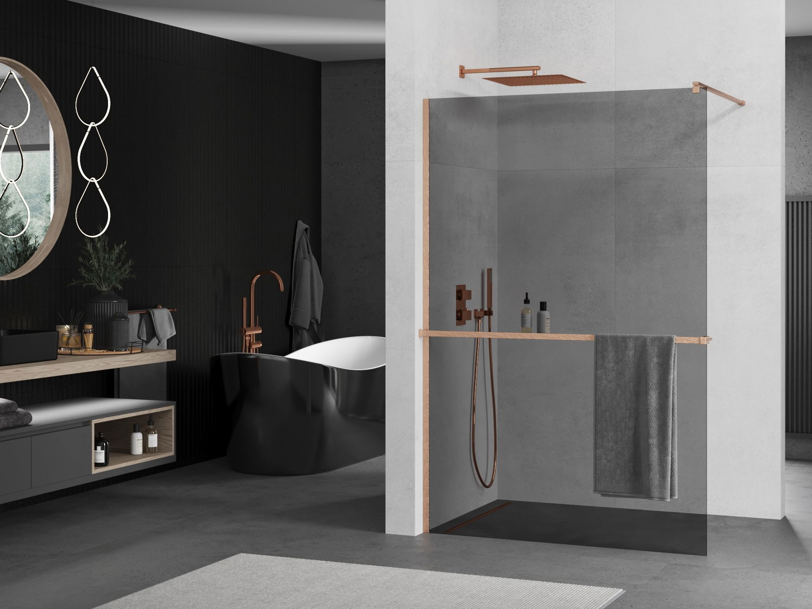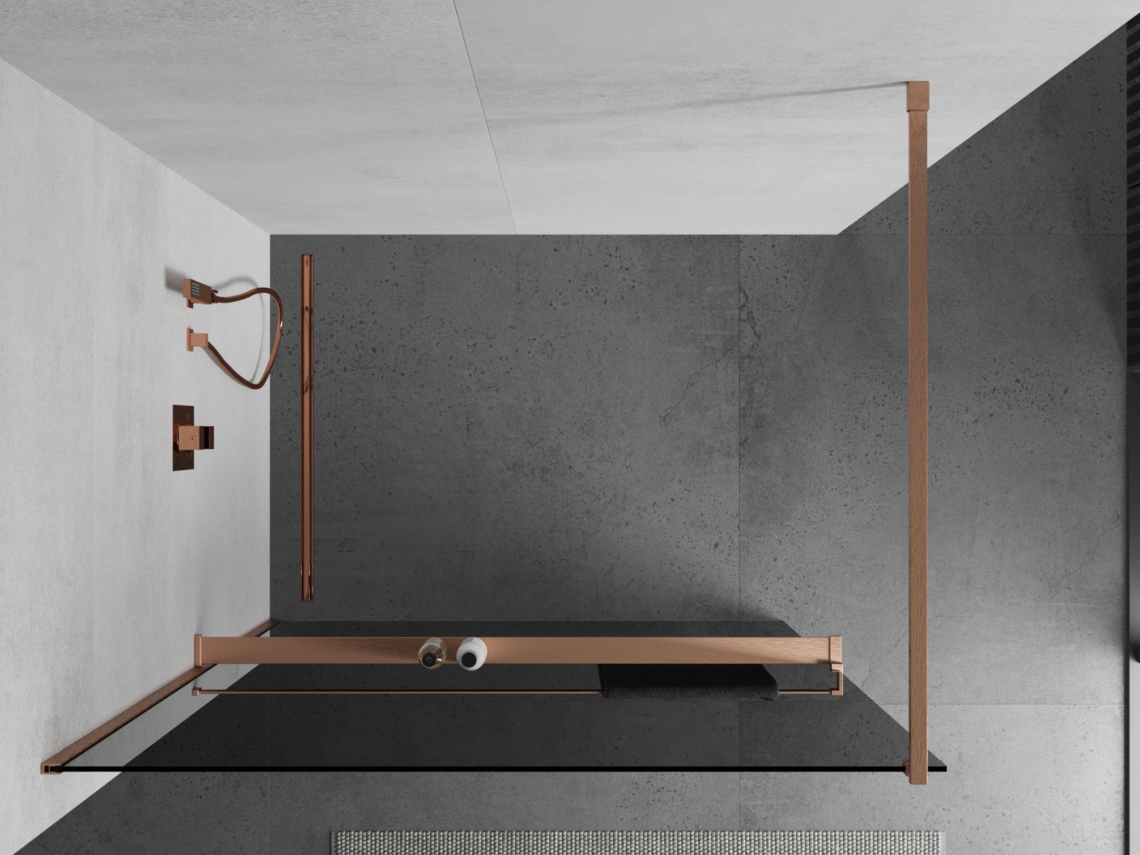 Mexen Kioto+ shower wall with Walk-in shelf 130 x 200 cm, graphite, brushed copper - 800-130-121-65-40