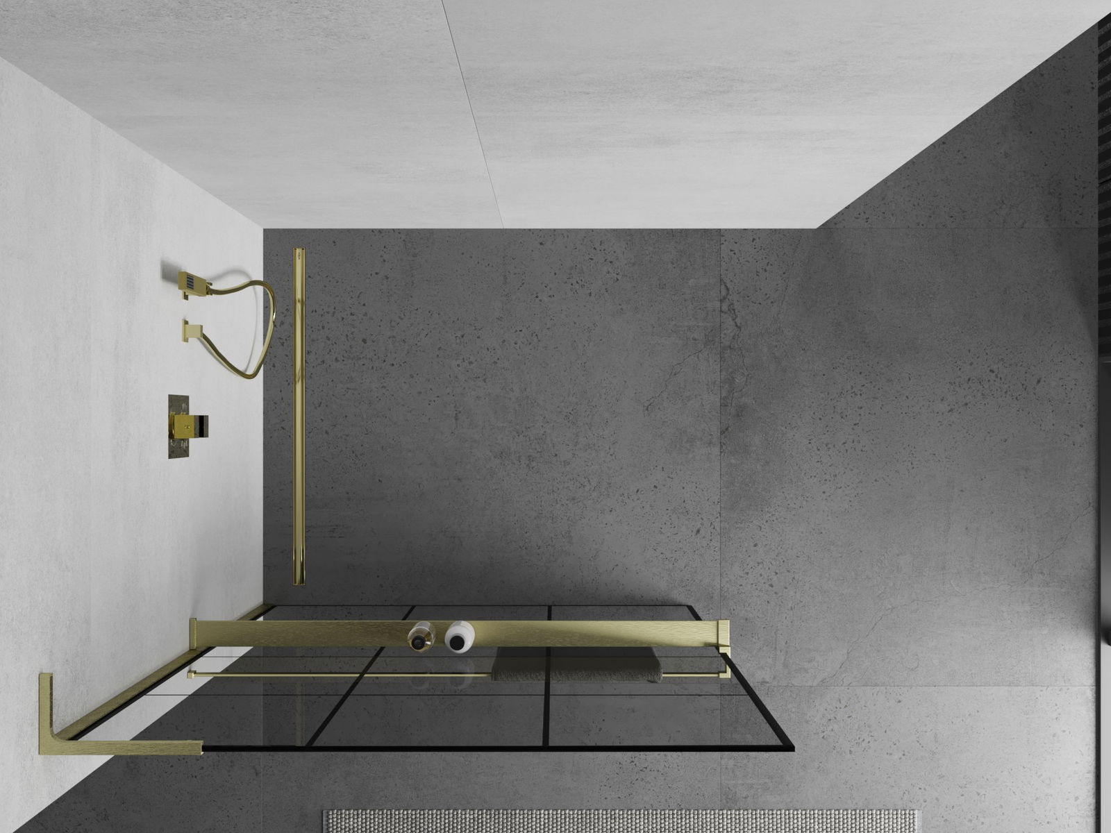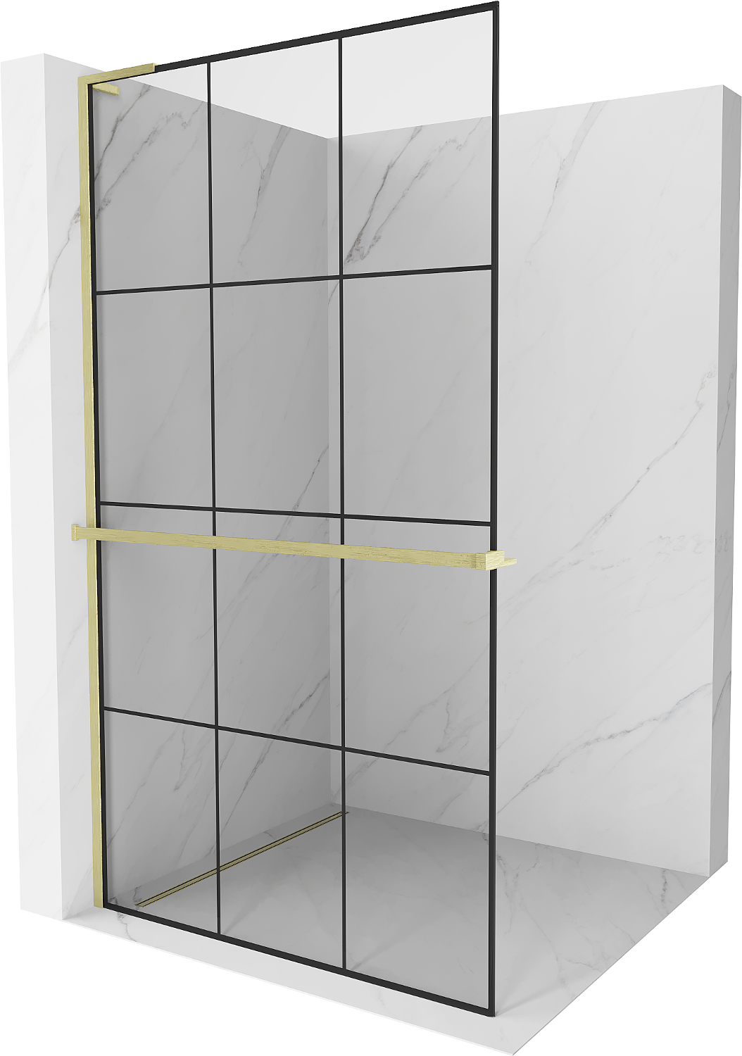 Mexen Kioto+ L shower panel with Walk-in shelf 110 x 200 cm, black grid, brushed gold - 800-110-123-55-77