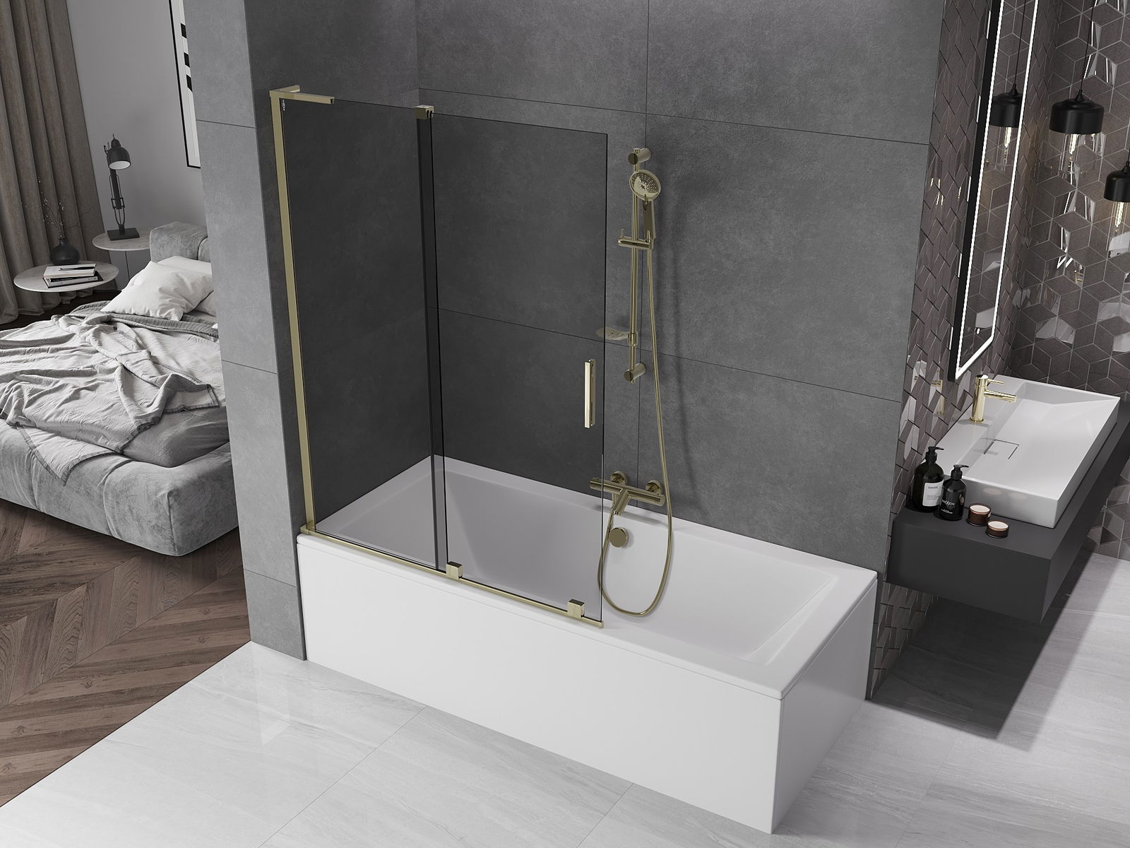 Mexen Velar L bath screen 2-wing sliding 120 x 150 cm, graphite, gold - 896-120-003-41-50