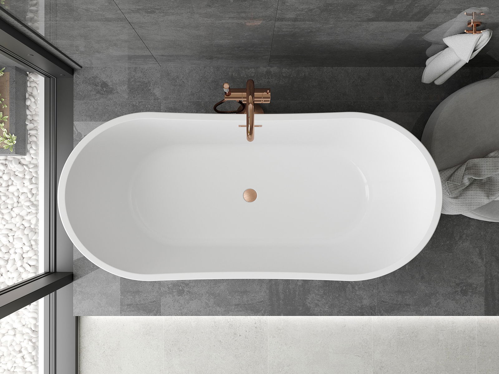 The freestanding bathtub is the perfect solution for any modern bathroom. Its dimensions of 170 x 80 cm and a height of 72 cm ensure comfortable use. Made of sanitary acrylic, it is resistant to tarnishing and UV radiation, guaranteeing long-lasting shine. The oval shape and snow-white color perfectly fit into the aesthetics of contemporary interiors. Additionally, brushed copper in the finish elements highlights its elegant appearance. The set includes a siphon and a click-clack plug.