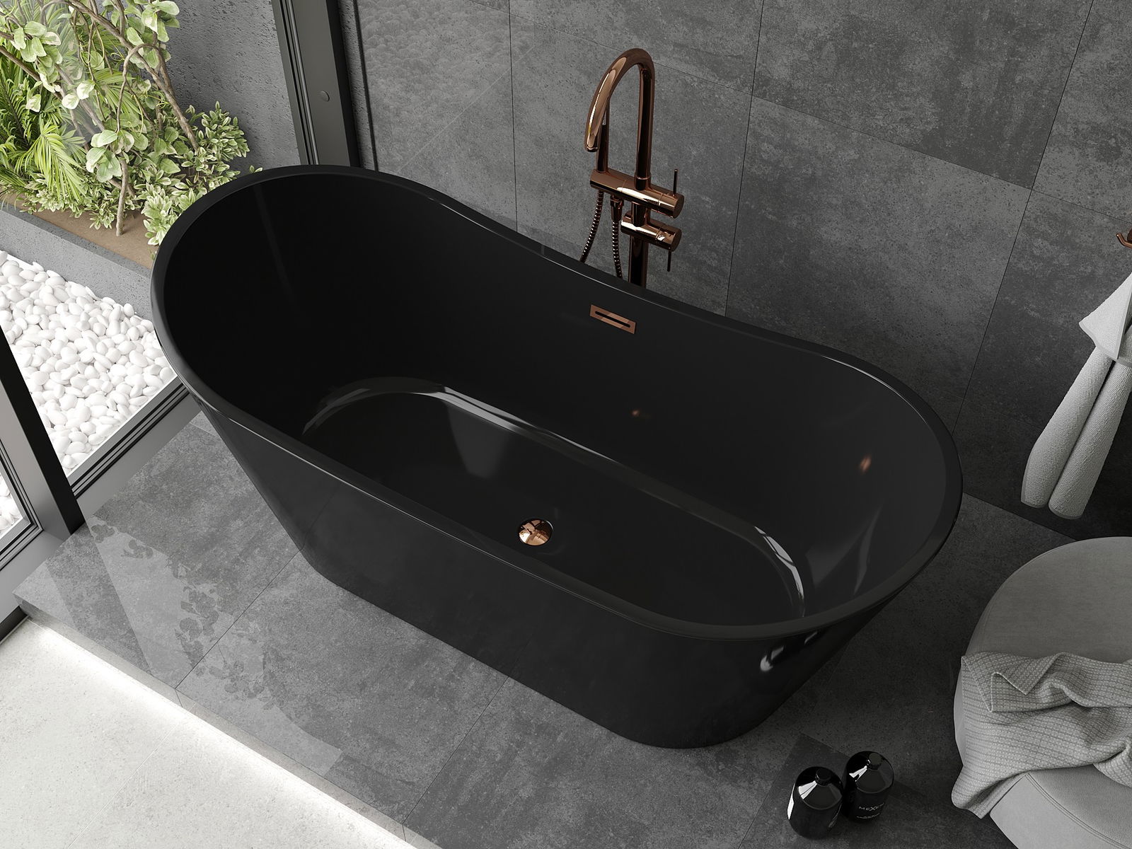 The Mexen Montana freestanding bathtub with dimensions of 170 x 80 cm combines modern design with functionality. Made of sanitary acrylic, it features an elegant black color and rose gold finish, adding an exceptional character. The oval shape and central overflow ensure comfortable use. The bathtub is resistant to tarnishing and UV radiation, guaranteeing a long-lasting effect. The set includes a siphon and click-clack plug.