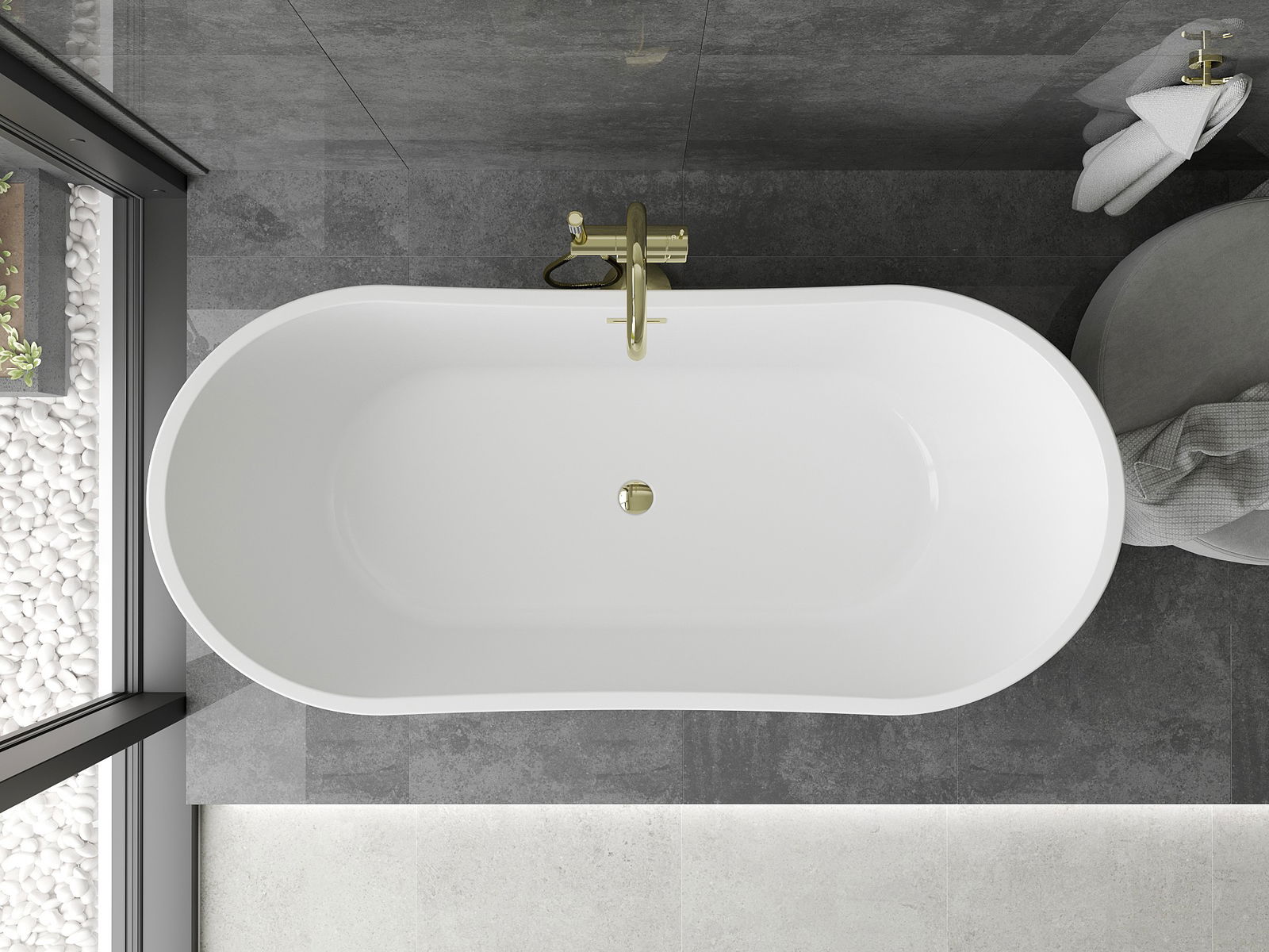The Mexen Montana is an elegant, freestanding bathtub measuring 170 x 80 cm, made from high-quality sanitary acrylic in a white-black color. With its unique gold finish and oval shape, the bathtub fits perfectly into modern bathrooms. The applied technology ensures resistance to dulling and UV radiation. The package includes a siphon and a click-clack plug, making it easy to use. Ideal for relaxation and leisure.