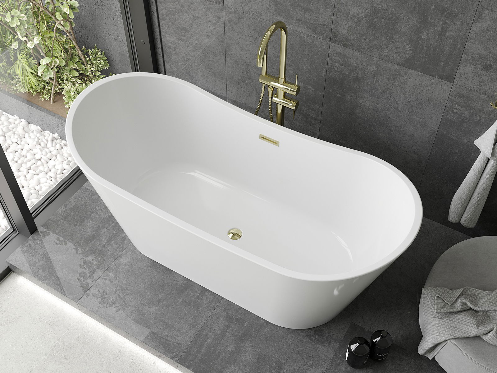 Mexen Montana is an elegant, oval freestanding bathtub measuring 180 x 80 cm, perfect for any modern bathroom. Made from sanitary acrylic, it features excellent resistance to tarnishing and UV radiation. The white color and gold finish give it a unique character, and the overflow hole provides additional safety. The bathtub is easy to install and comes with a strainer drain version. The set includes a siphon and click-clack plugs, making it a practical choice for every user.