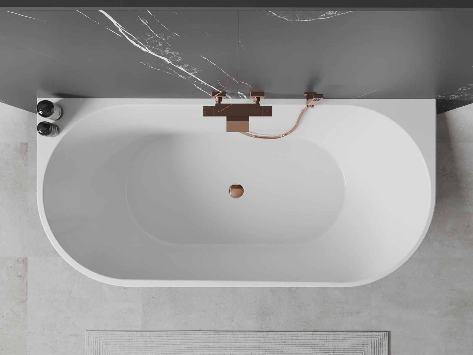 We offer an Oval freestanding wall-adjacent bathtub measuring 140 x 75 cm, made of sanitary acrylic in an elegant white color. Its modern, oval shape and glossy surface highlight the unique style of any bathroom. The bathtub features an overflow hole and a siphon with a rose gold click-clack plug, ensuring both functionality and aesthetics. Thanks to its resistance to tarnishing and UV rays, it is durable and easy to maintain.