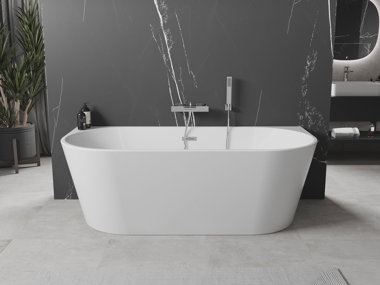 Discover elegance with the freestanding back-to-wall bathtub, measuring 150 x 75 cm, in white. Made of sanitary acrylic, it offers high resistance to dulling and UV radiation, ensuring it retains its original appearance for a long time. The oval shape and chrome finish impart a modern style, perfect for any bathroom. Equipped with an overflow hole and complete with a siphon and click-clack plug, it is also easy to install and maintain. It's an excellent choice for those who value comfort and aesthetics.