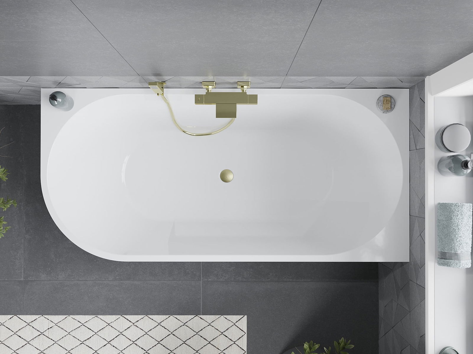 Mexen Mia freestanding corner right bathtub 150 x 75 cm, white/black, brushed gold overflow - 52691507575P-55