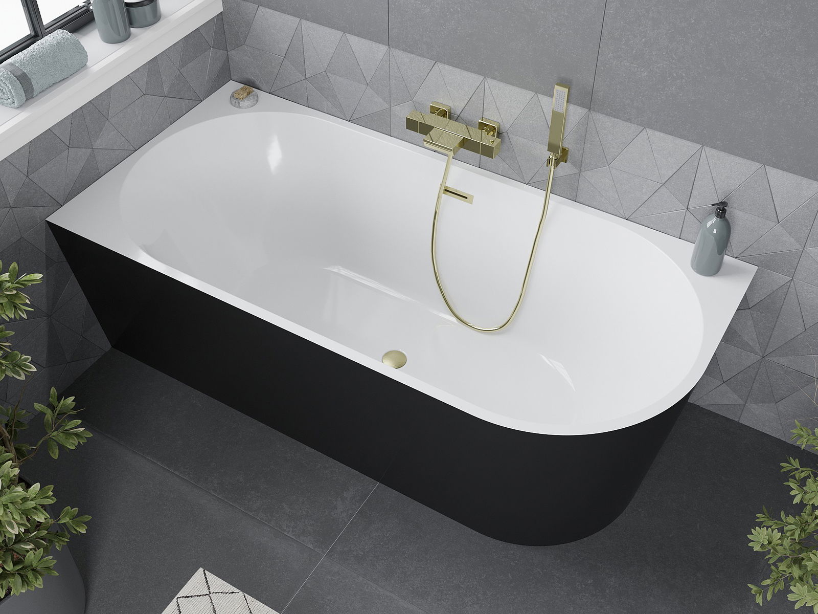 The left corner freestanding bathtub measuring 160 x 75 cm is the perfect combination of elegance and functionality. Made from sanitary acrylic, it is available in a trendy white-black combination with a brushed gold finish. It features a center drain and an overflow hole, ensuring user convenience. With resistance to dulling and UV radiation, its appearance remains impeccable for a long time. It is an excellent choice for a modern bathroom.
