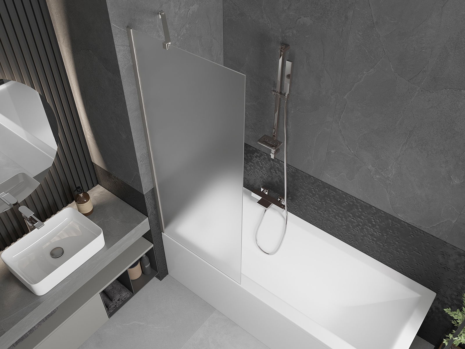 Effective protection against water spilling during bathing. The screen has seals that perfectly fit the glass surface and the edge of the bathtub. A functional solution ensuring safety and easy maintenance of cleanliness.