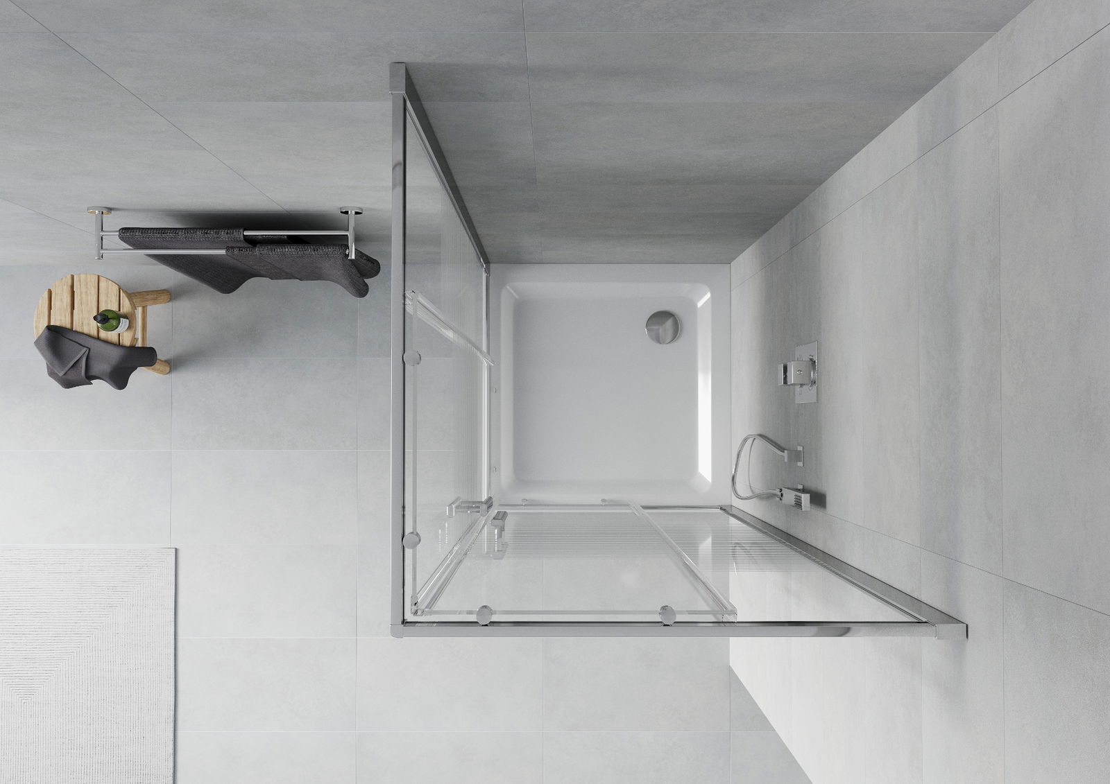 The shower tray is designed in such a way that water can freely flow towards the drain. It ensures quick and effective drainage of water from the surface of the shower tray, preventing the formation of puddles and flooding the bathroom.