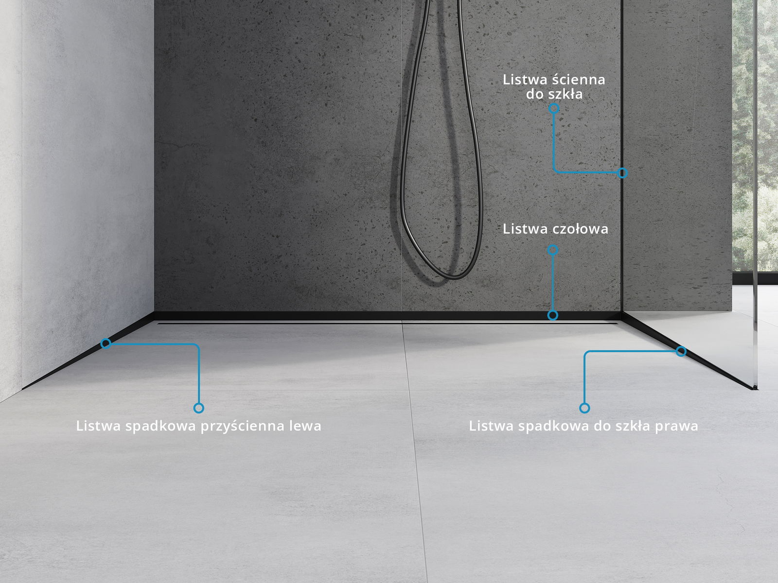 The front strip complements the use of slope strips, creating a coherent whole in the shower area