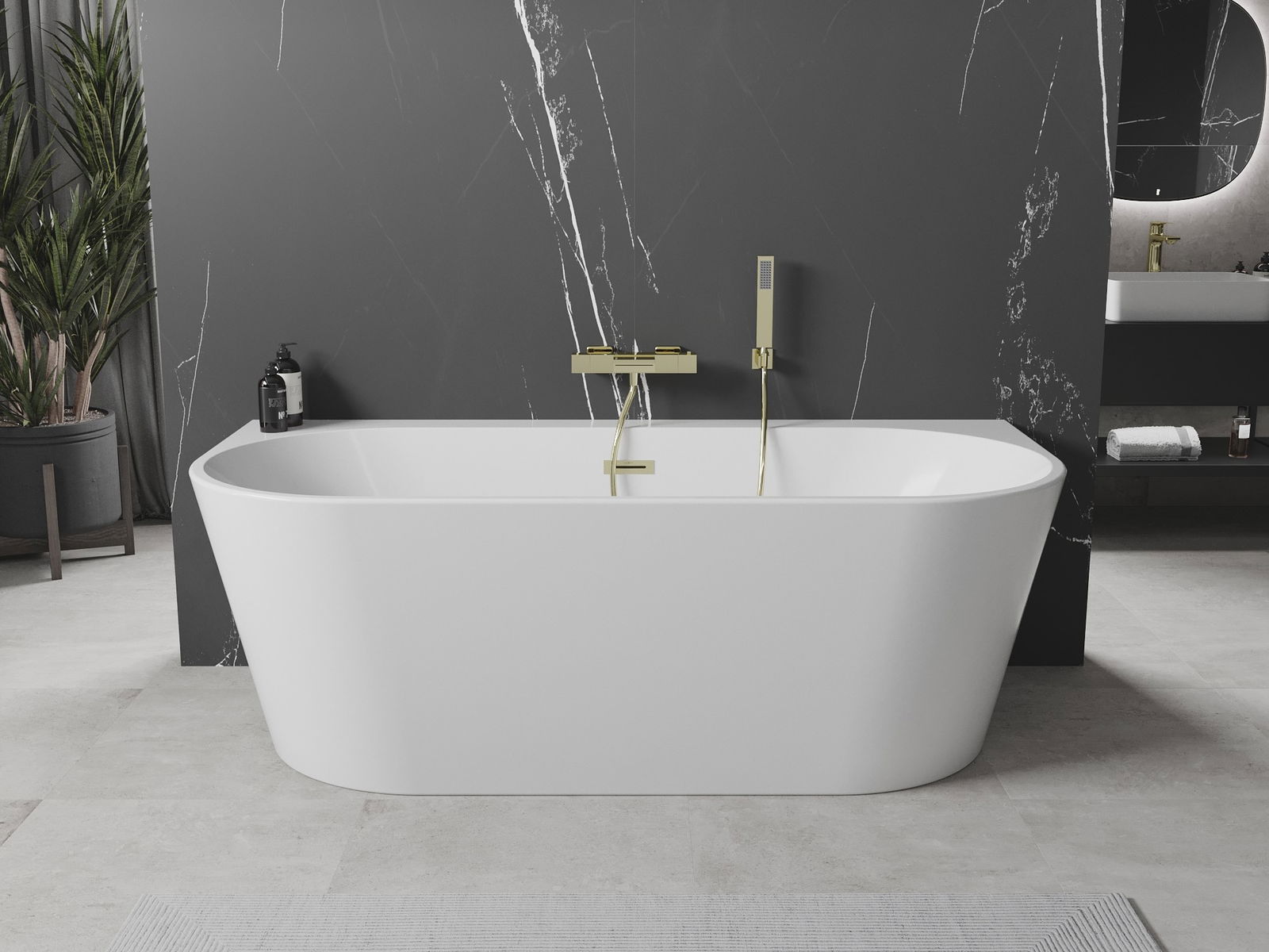 The bathtub has a wide rim on one side, which creates a practical shelf. This allows for convenient storage of soap, cosmetics, or other bath accessories within easy reach, providing even greater comfort.