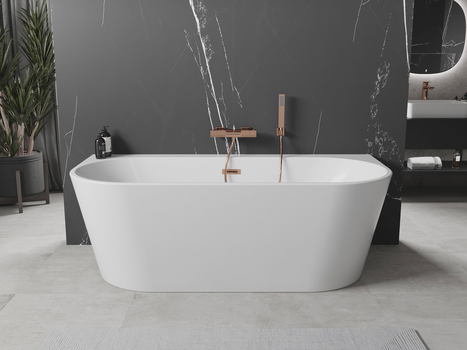 The bathtub has a wide rim on one side, which creates a practical shelf. This allows for convenient storage of soap, cosmetics, or other bath accessories within easy reach, providing even greater comfort.