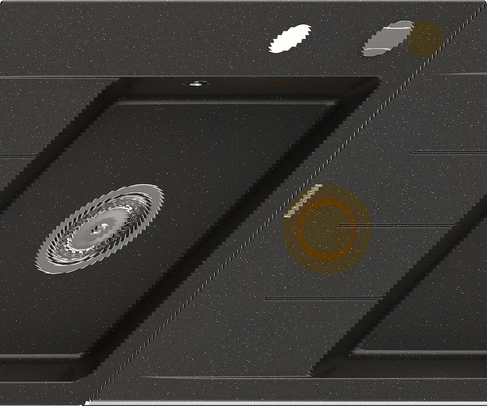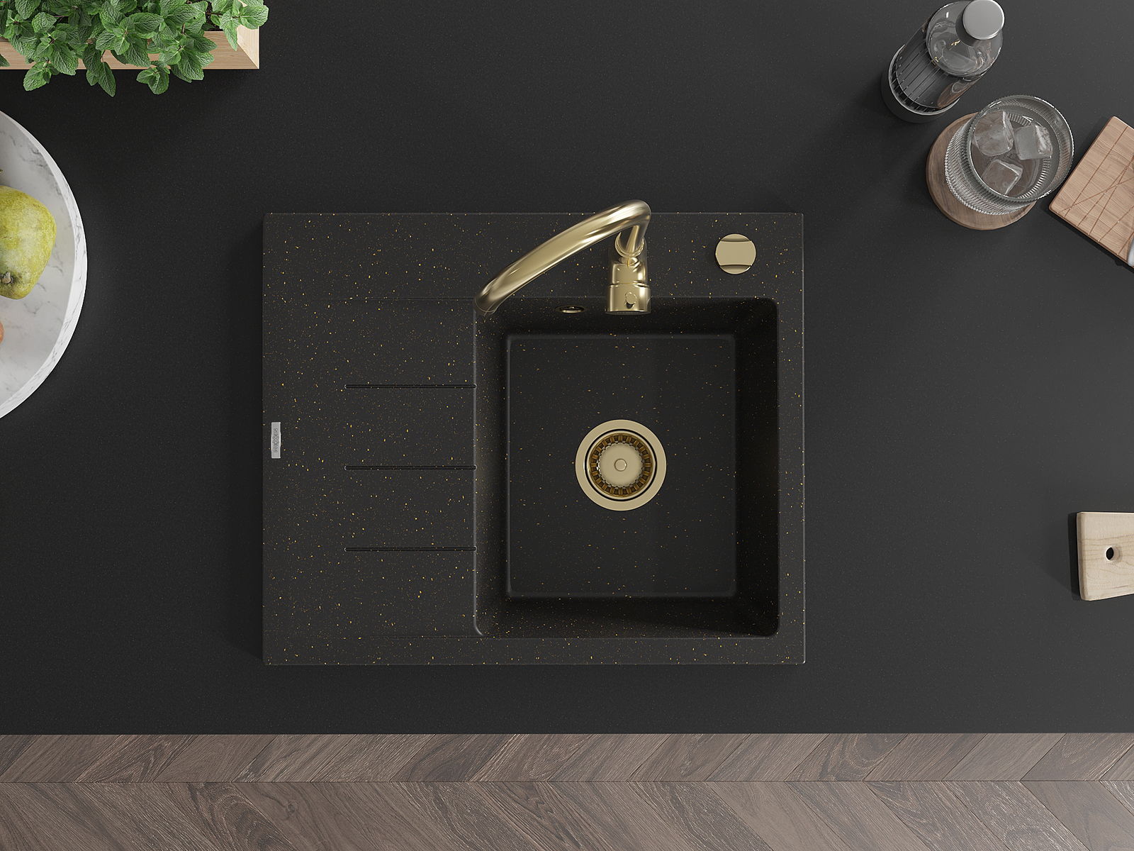 Mexen Ben granite sink 1-bowl with drainer, right 600 x 500 mm, black/gold metallic, gold siphon - 6523605000-75-G