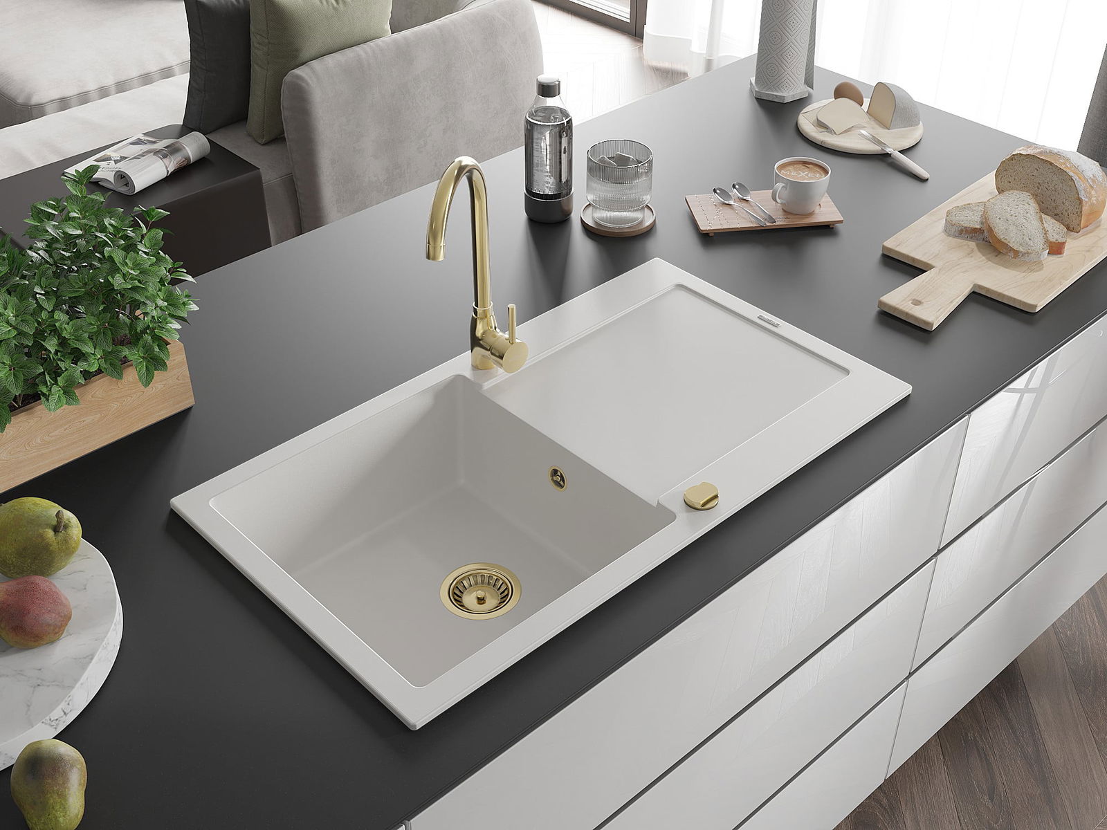 Choosing a sink with a draining board is a practical solution that allows you to set aside washed dishes or vegetables and fruits. The draining board makes daily cooking easier and helps maintain order in the kitchen.