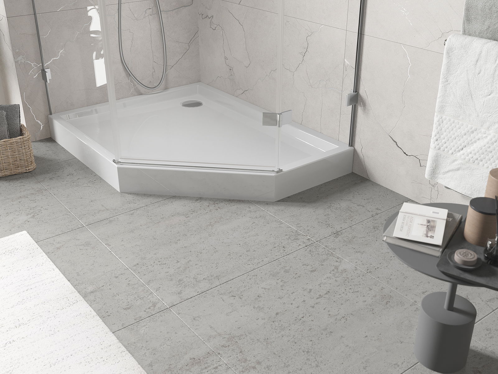 The shower tray is designed in such a way that water can freely flow towards the drain. It ensures quick and effective drainage of water from the surface of the shower tray, preventing the formation of puddles and flooding the bathroom.