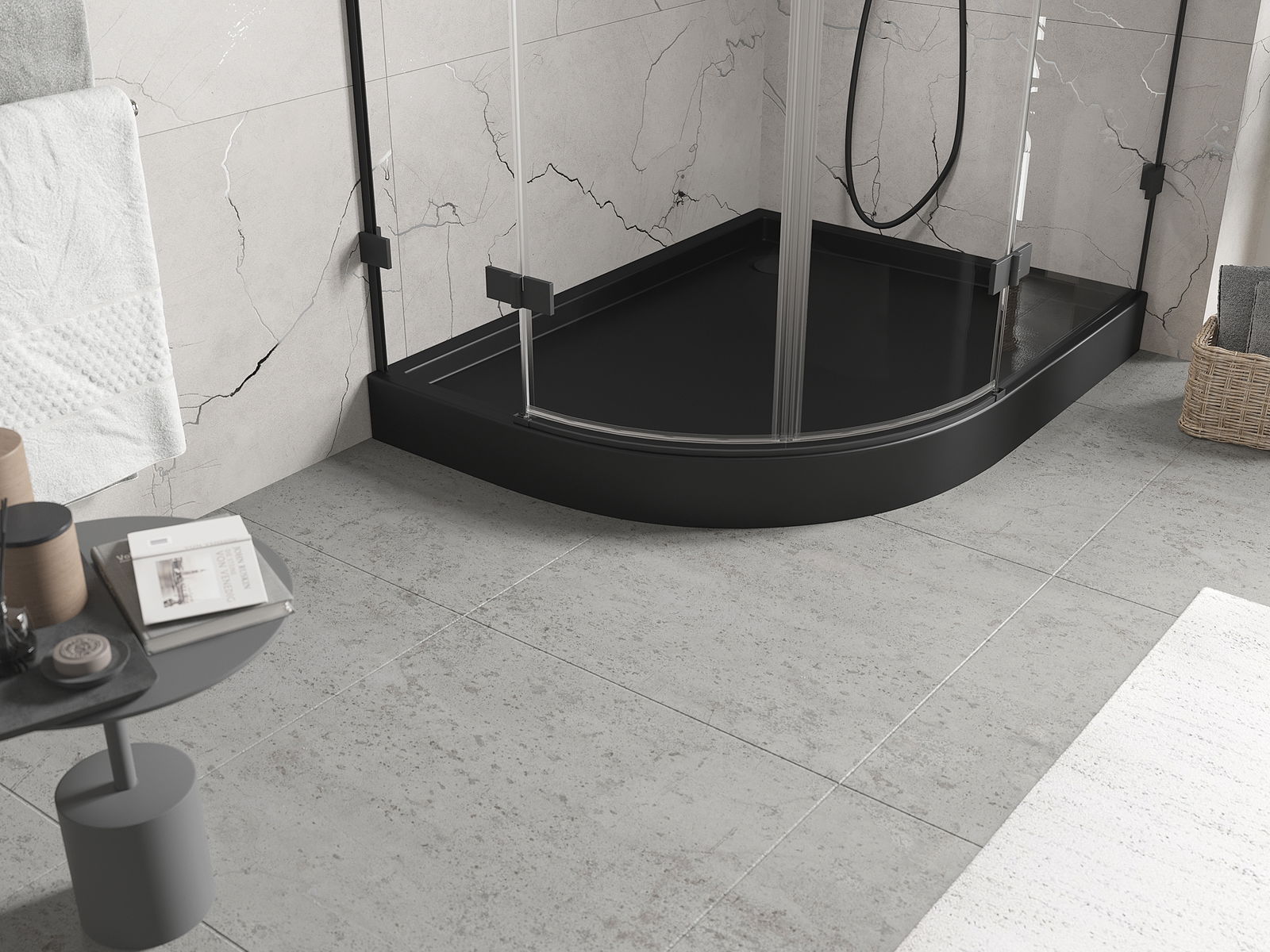 The shower tray is designed in such a way that water can freely flow towards the drain. It ensures quick and effective drainage of water from the surface of the shower tray, preventing the formation of puddles and flooding the bathroom.
