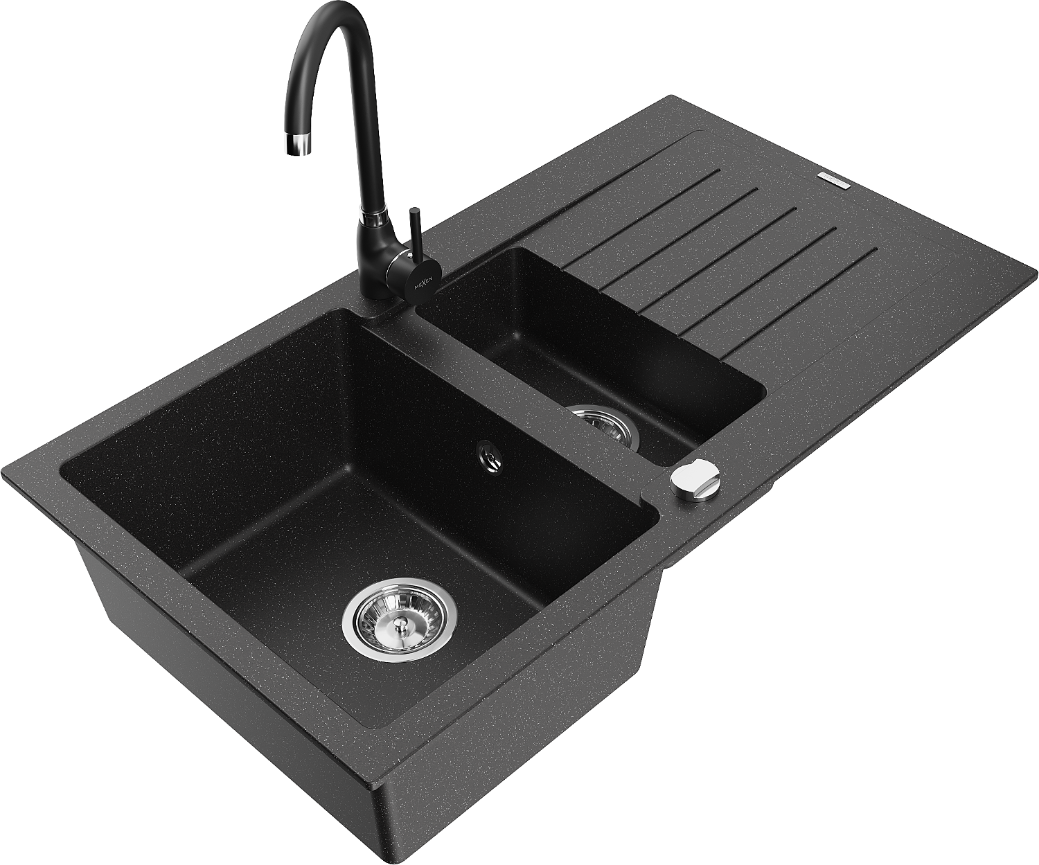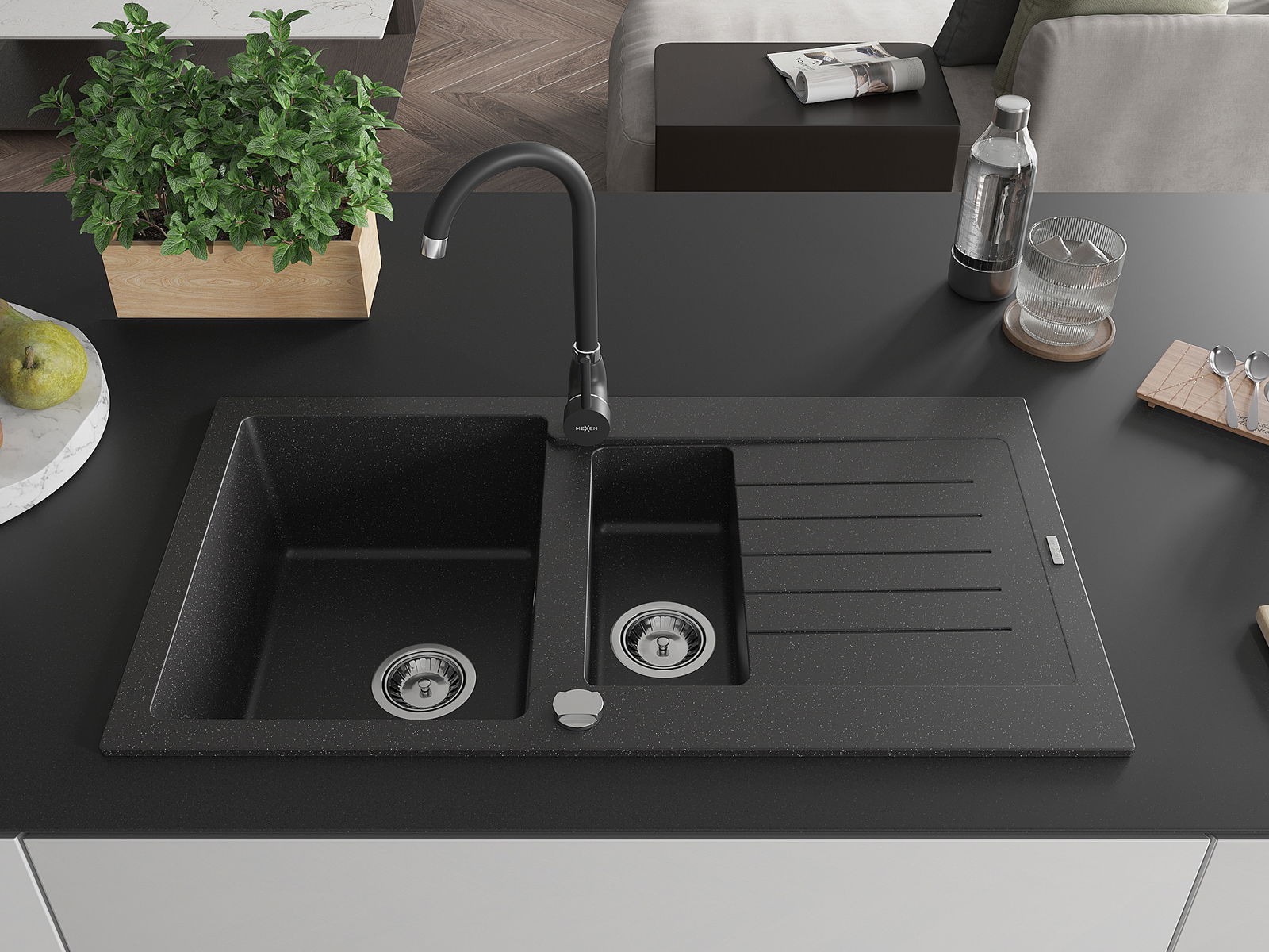 Mexen Matias granite sink 1.5-bowl with drainer and Telma kitchen tap, black/silver - 6502-73-670200-70