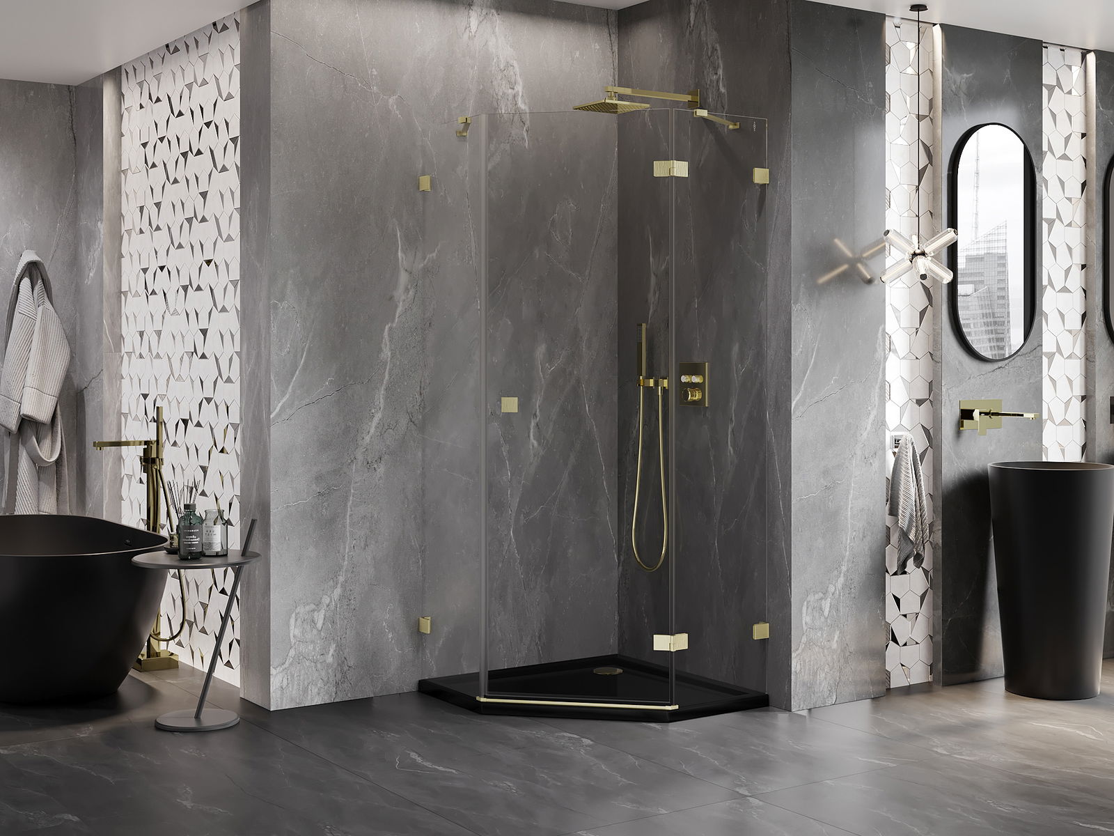 Mexen Lunar pentagonal shower enclosure hinged right 80 x 80 cm, transparent, brushed gold - 831-080P-080L-55-00-P