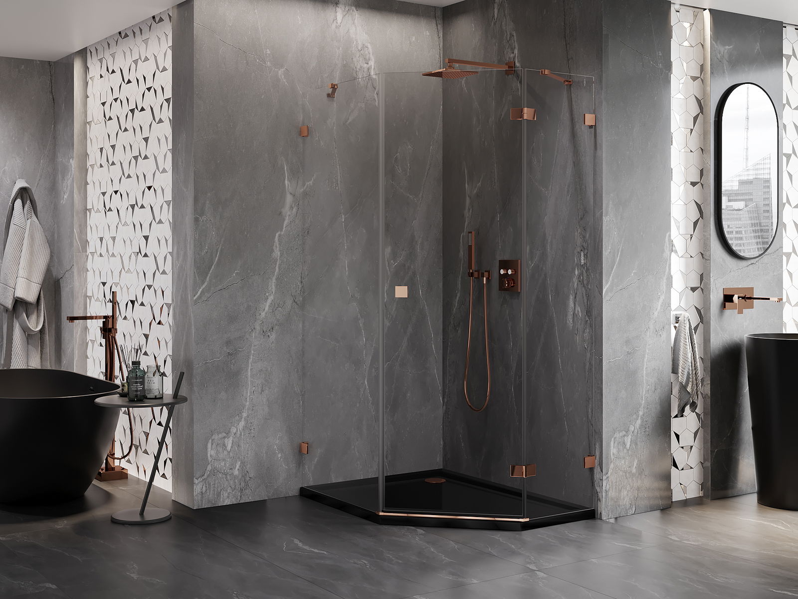 Mexen Lunar pentagonal right-hinged shower enclosure 90 x 100 cm, transparent, rose gold - 831-090P-100L-60-00-P