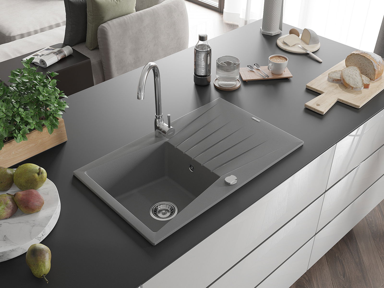 Choosing a sink with a draining board is a practical solution that allows you to set aside washed dishes or vegetables and fruits. The draining board makes daily cooking easier and helps maintain order in the kitchen.