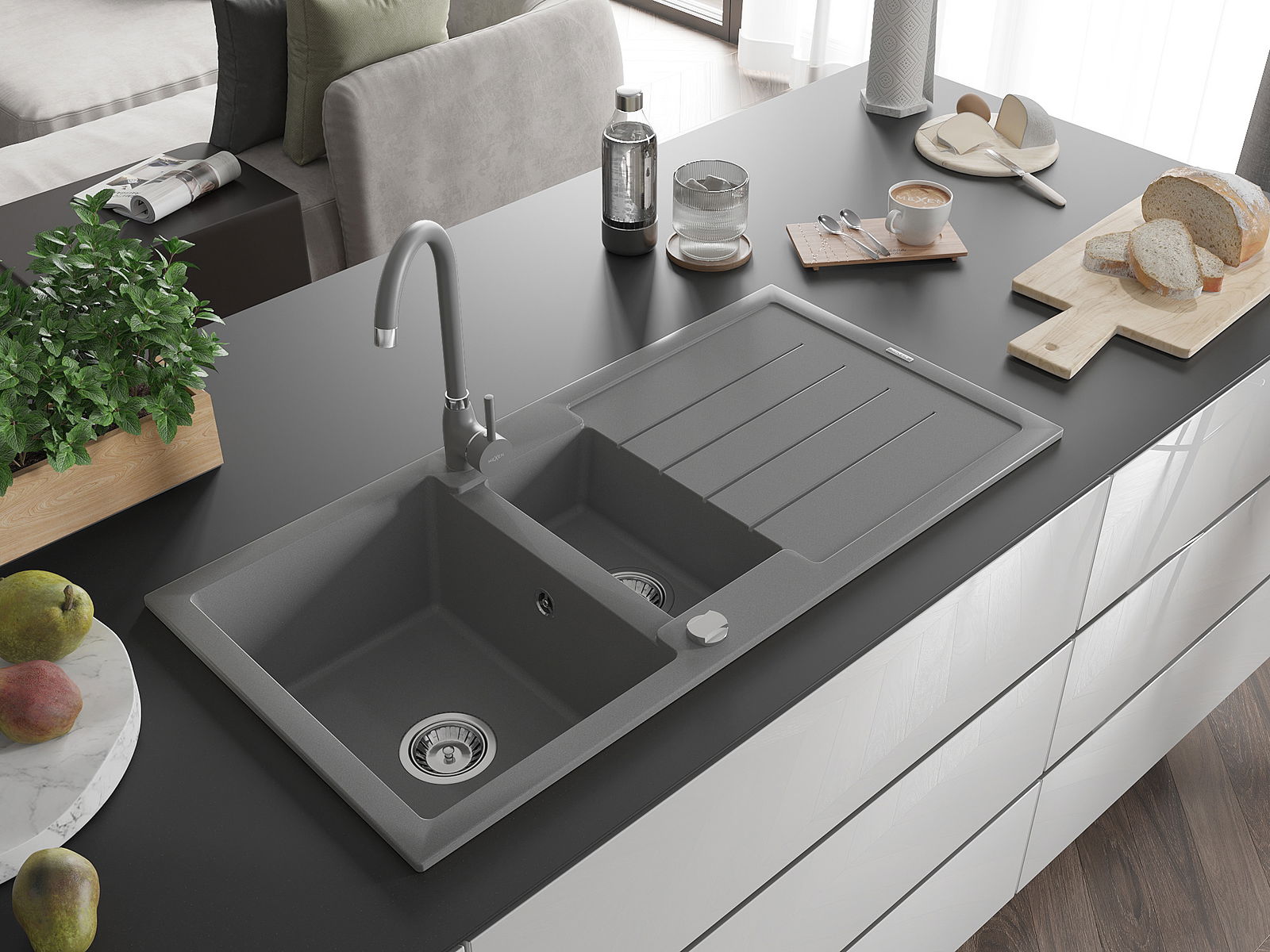 Choosing a sink with a draining board is a practical solution that allows you to set aside washed dishes or vegetables and fruits. The draining board makes daily cooking easier and helps maintain order in the kitchen.