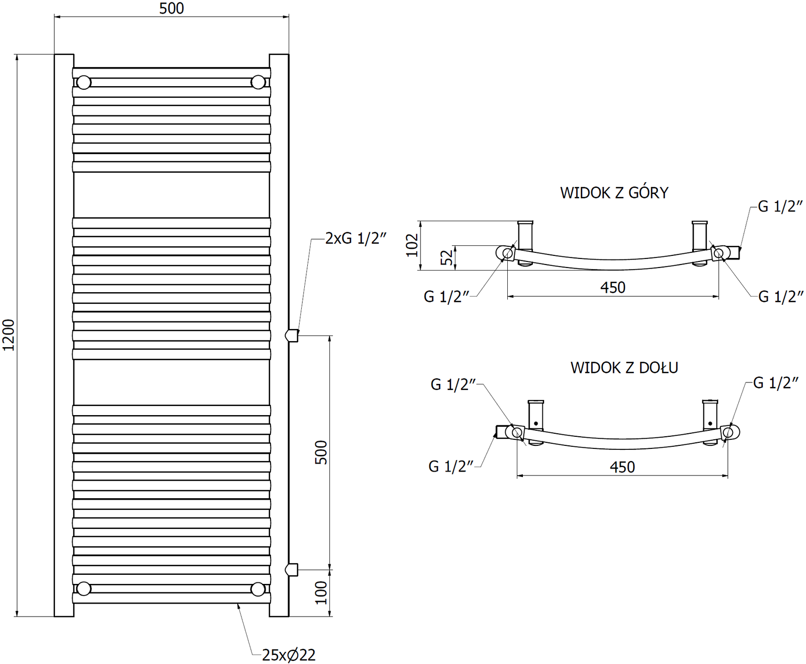 - 2xG ½″ side on the right