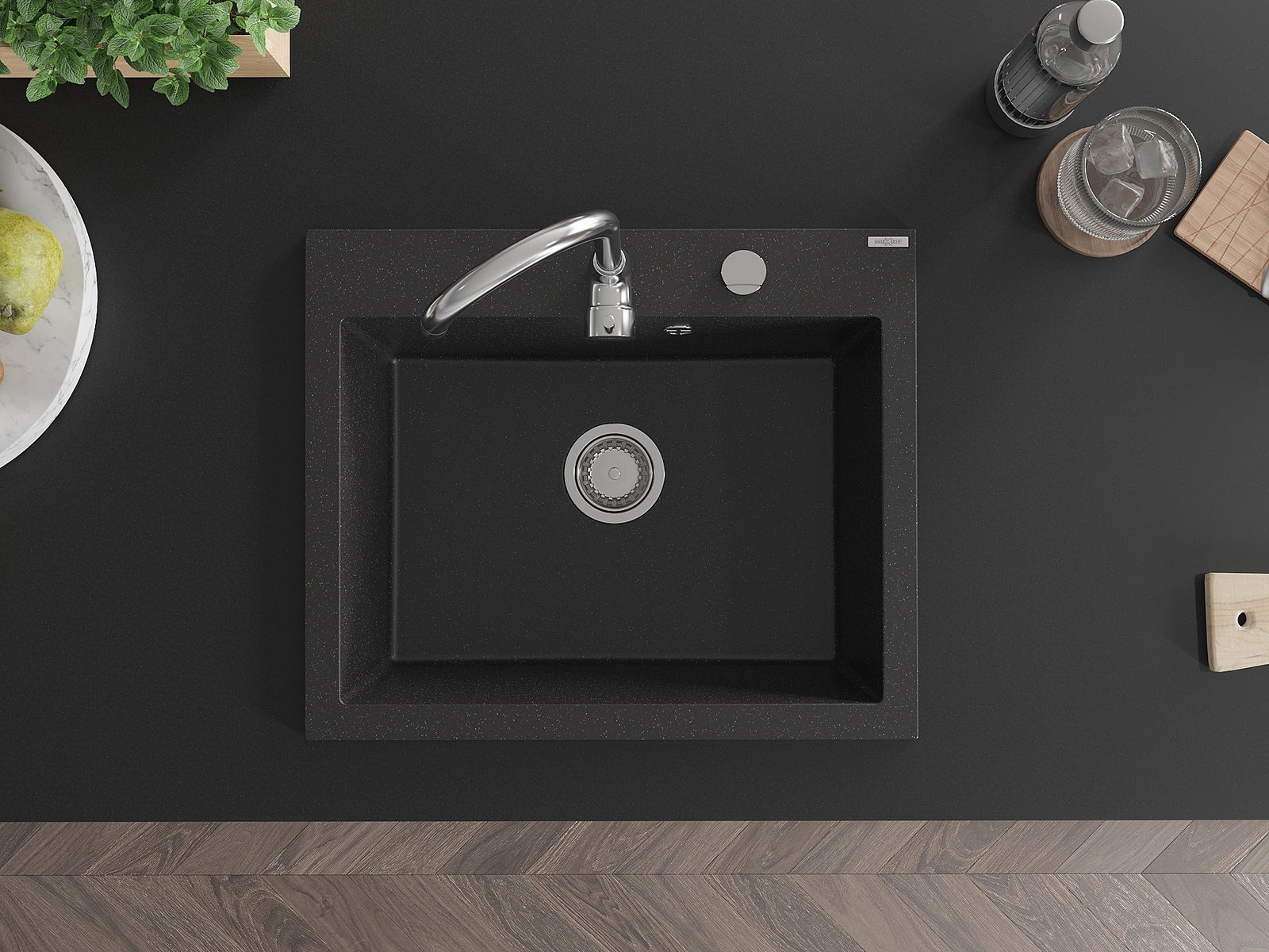 Mexen Elix granite sink 1-bowl 600 x 500 mm, black/silver metallic, chrome siphon - 6525601005-73
