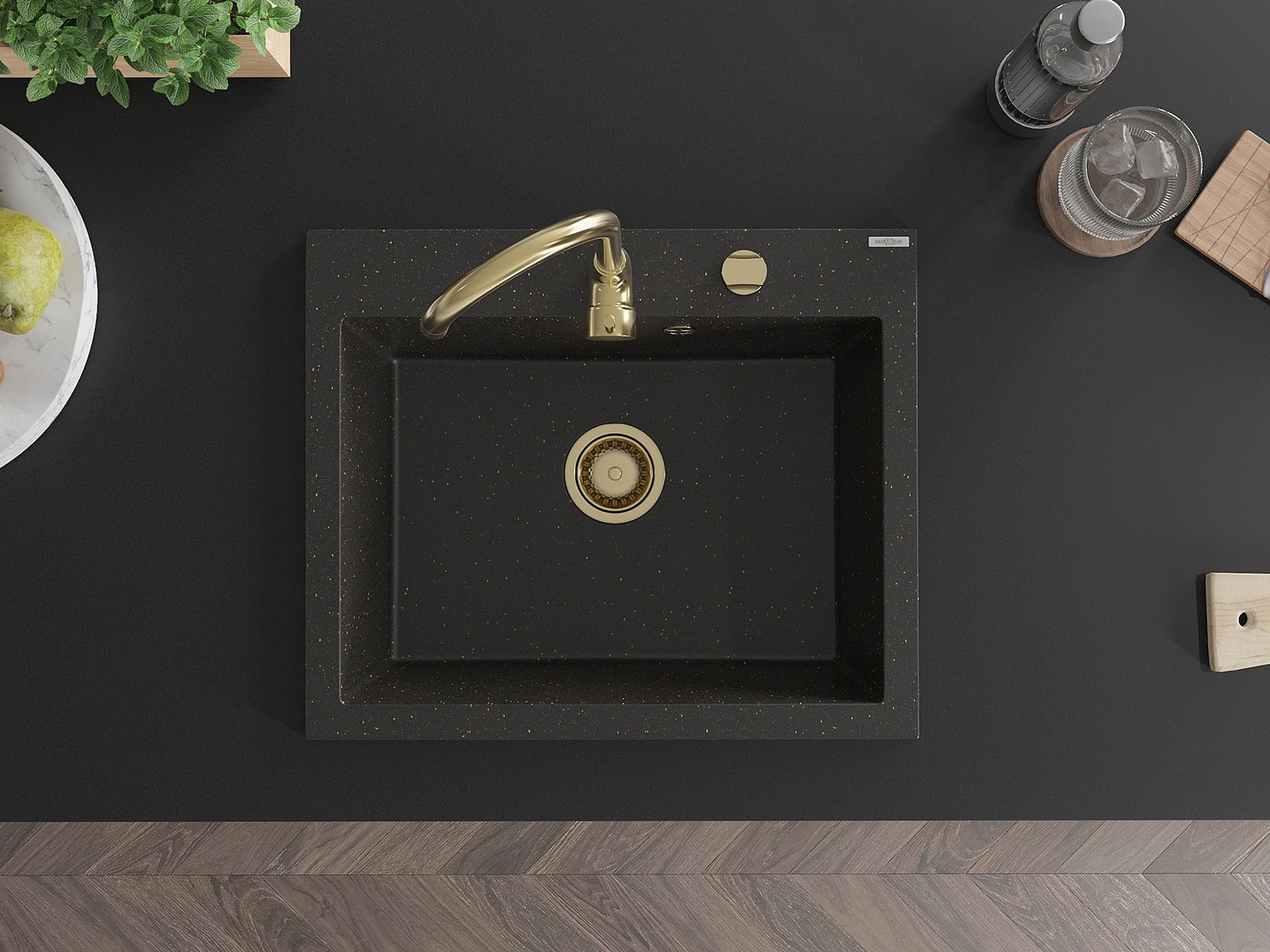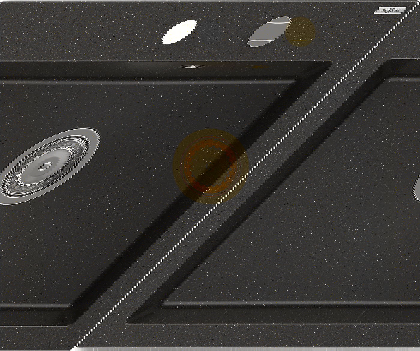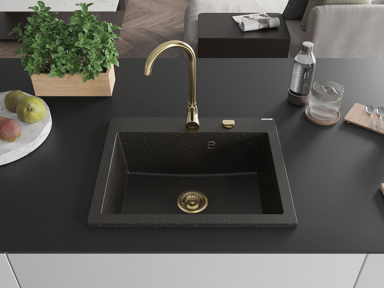 Mexen Elix Granite Sink 1-Bowl 600 x 500 mm, Black/Gold Metallic, Gold Siphon - 6525601005-75-G