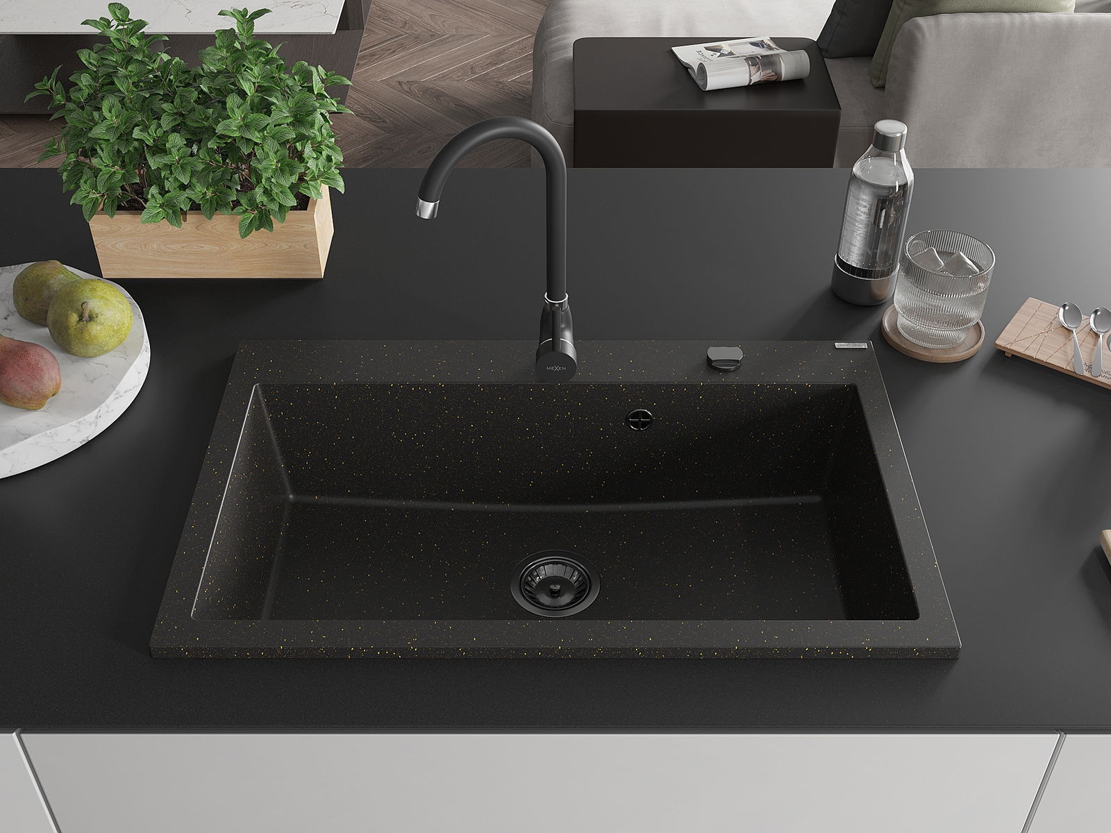 Mexen Elix granite sink 1-bowl 800 x 500 mm, black/golden metallic, black siphon - 6527801005-75-B
