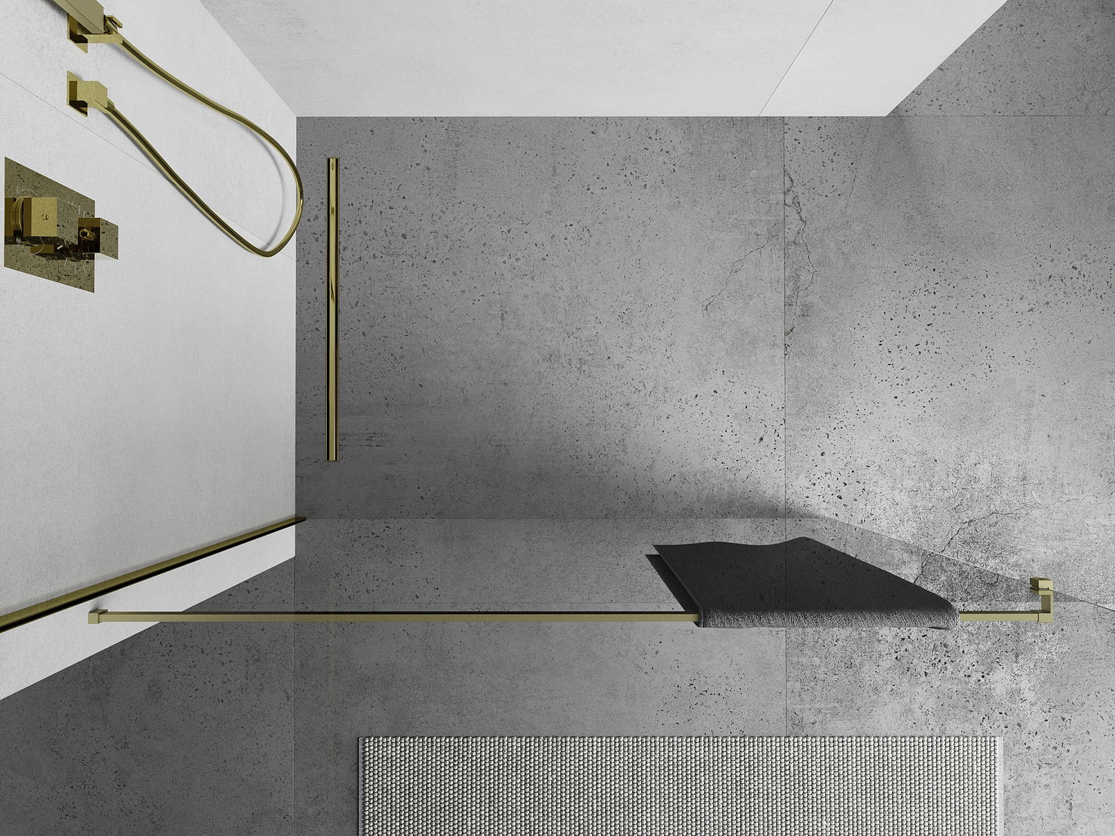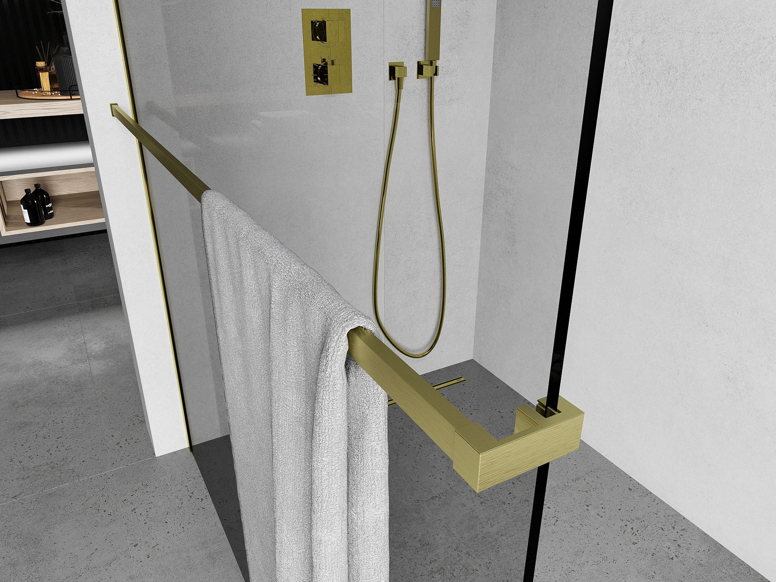 A towel rail mounted on the shower screen is a practical and functional solution that allows for convenient hanging of towels in the immediate vicinity of the bathing area, which increases the comfort of everyday use.